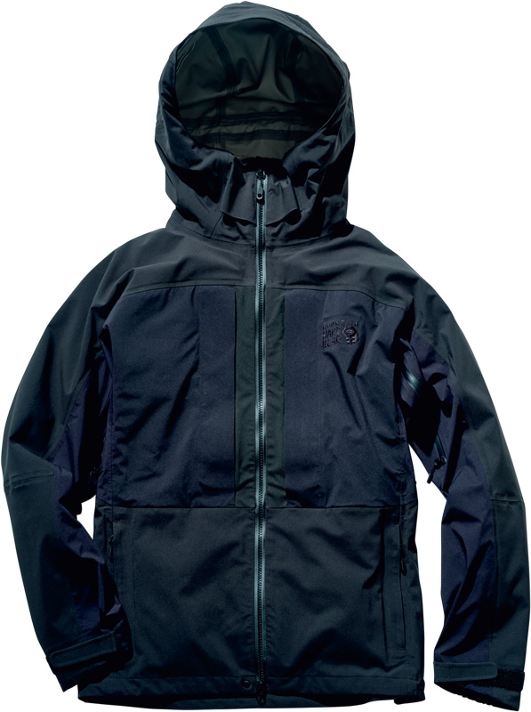 軽量でしなやかなゴアテックスアクティブをベースに、補強が必要な肩や肘、腰に耐久性が高いゴアテックスプロを配置したハイブリッドハードシェル。襟はフードから独立しているため保護性が高い。