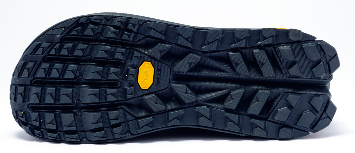 吸い付くように高いグリップ力を発揮するヴィブラム・メガグリップをアウトソールに使用。岩場、濡れた路面でも滑りにくく安心感がある。