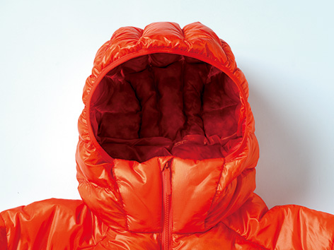 ダウンが封入されたストームフード。細かいキルトピッチでフィット感を高め、ヘルメットごと頭部を保温。呼吸時の湿気を受けやすい口元にも化繊中綿を封入。