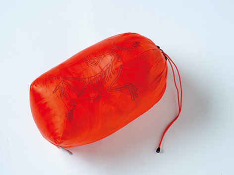 コンパクトに持ち運べるスタッフバッグを標準装備。取り外し可能なコードで胸の内ポケット内に連結され、コードを外さず出し入れ可能。カラビナループ付き。