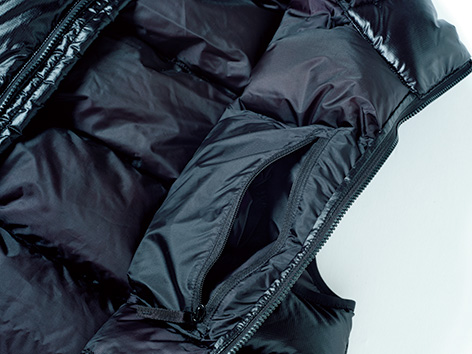 セキュリティポケットとして使える胸のファスナー付き内ポケット。表側にはファスナー付きのハンドウォームポケットが両サイドに。