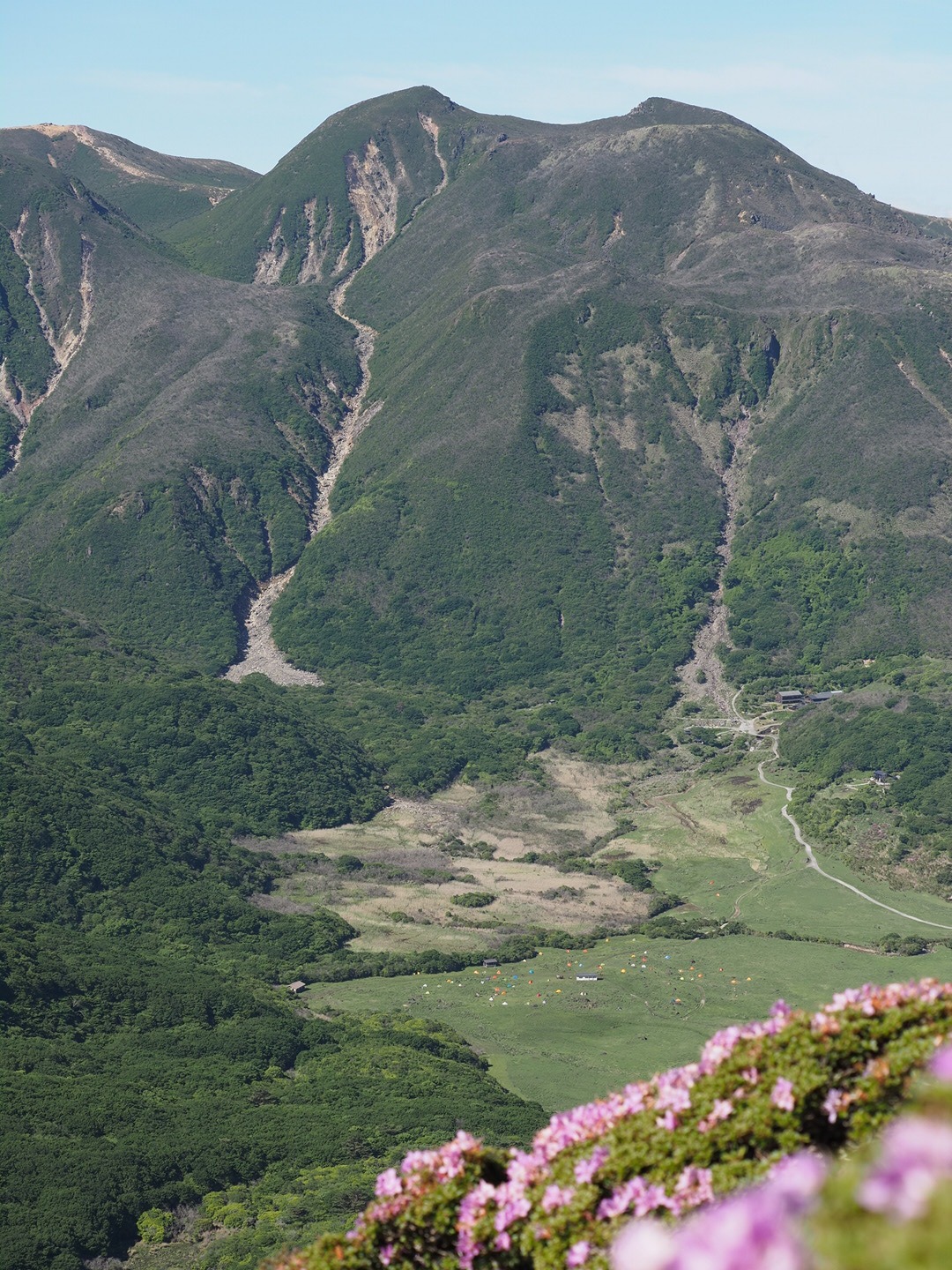 平治岳山頂すぐ手前から見える景色。くじゅう連山と坊ガツル、ミヤマキリシマ。全部を見渡すことができました。