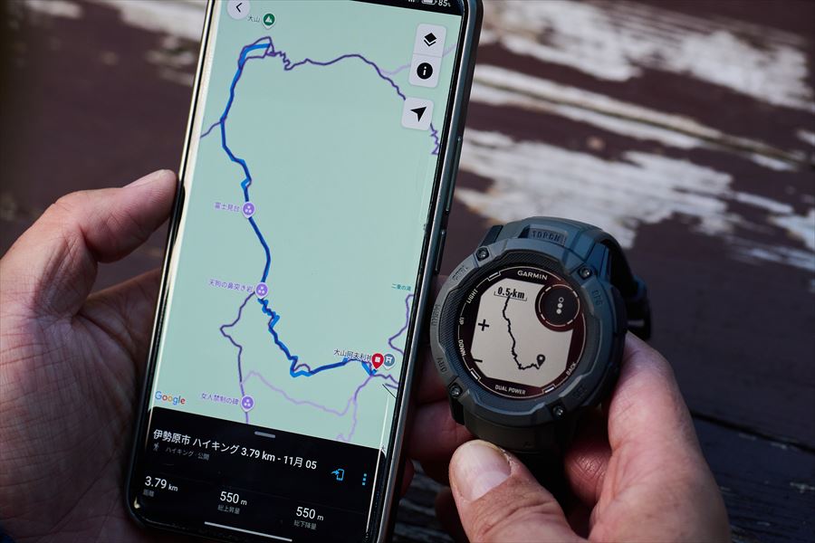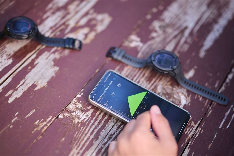 伊藤 上位機種の「fēnix(フェニックス)」だと時計に地図も出てくるんですが、「Instinct 2」は地図は表示されずルートの線のみになります。もちろん地図が出てくれば現在地の確認などもしやすいですが、アプリとうまく併用すれば問題ないですね。