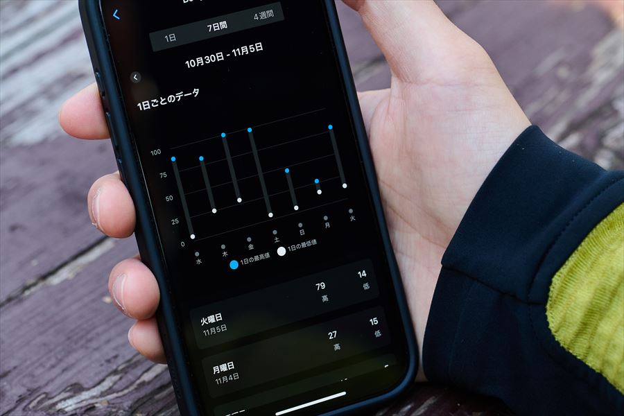 伊藤 そうですね、じつは昨夜あまり長い時間は寝られなかったので、チャージが足りないかもしれません。ちなみに過去のデータも残っているので、残量の推移を確認することもできておもしろいです。