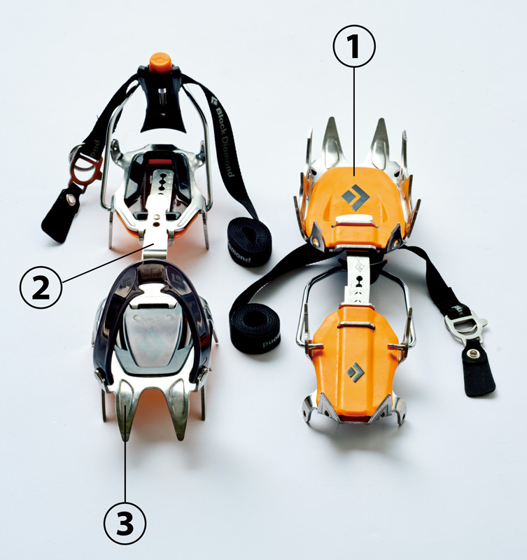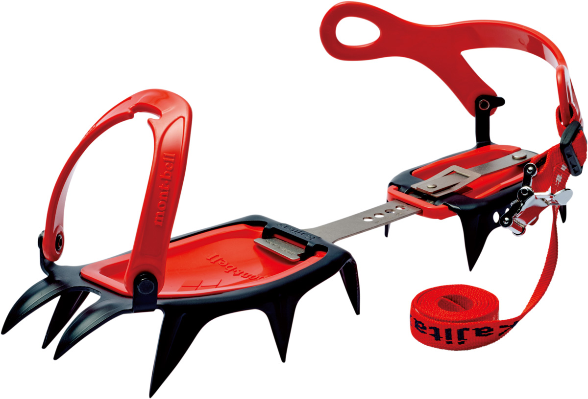アイスアックスと並ぶ雪山登山に欠かせないギアで、雪面でのスリップを防ぐのがクランポンだ。一般的な縦走には、フロントポイントが水平に付いた平爪で12本爪モデルが基本。足が小さい人は、登山靴とのフィット感を考慮して10本爪を選ぶこともある。