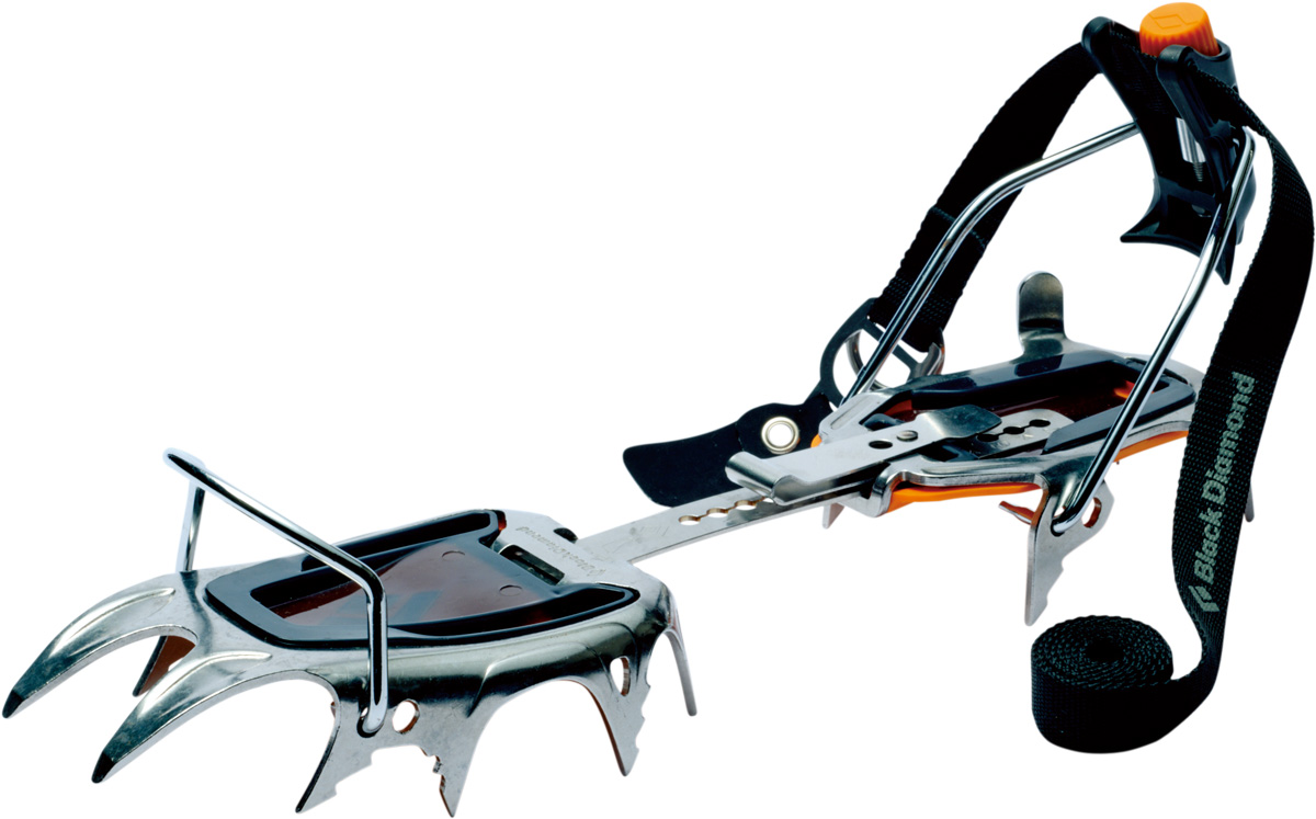 軽くて、丈夫で、錆びにくいステンレススチール製の12本爪。一般ルートからバリエーションルートまで対応する。2列目の爪が前に張り出しているため、横刃のフロントポイントとの効果で、急な斜面でも安定感を得られる。