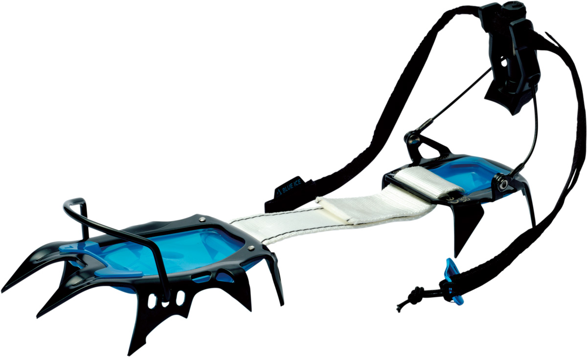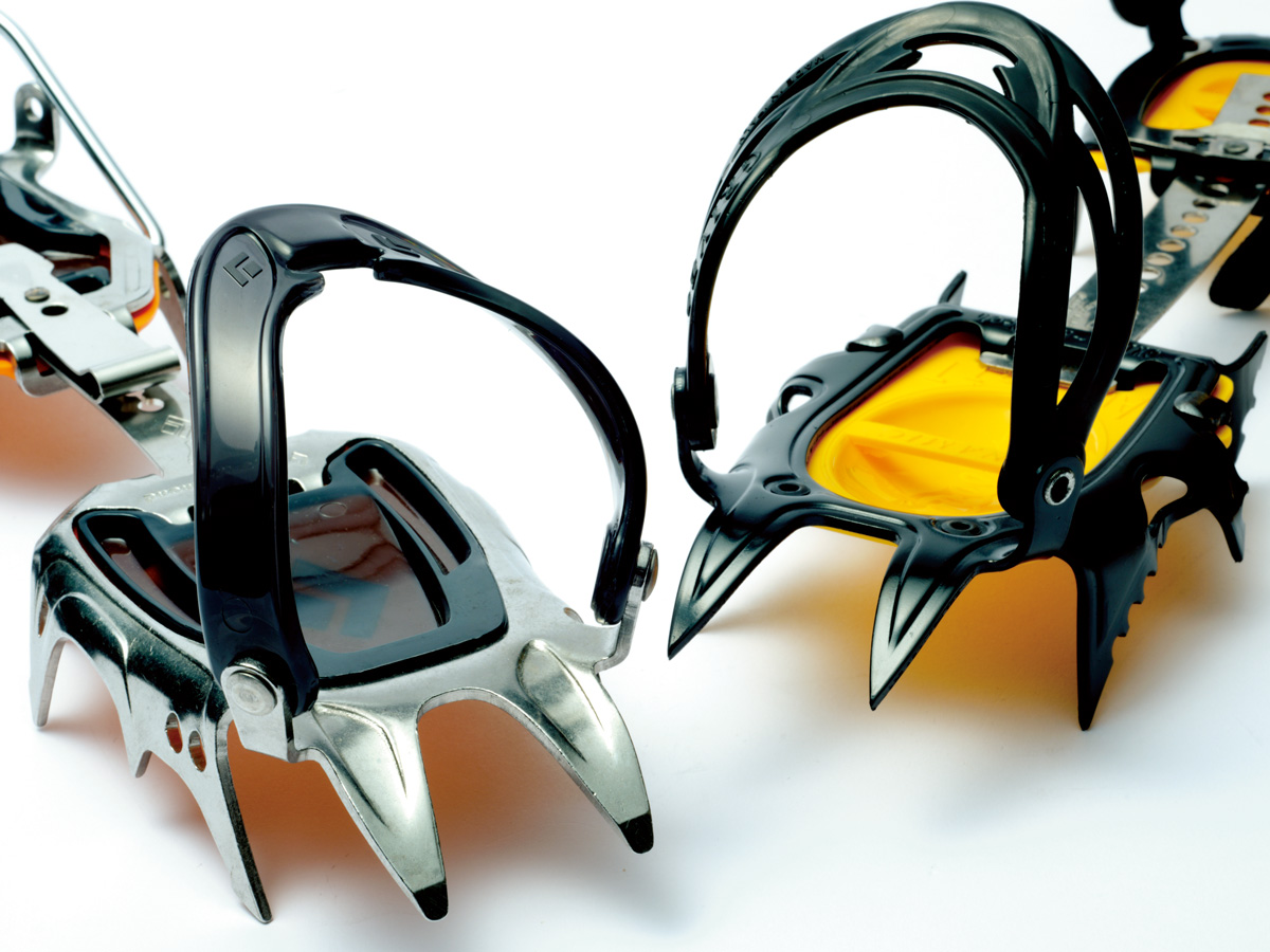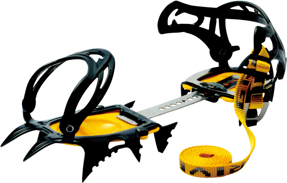 どんな登山靴にも合わせられる万能なタイプ。つま先とかかとの樹脂製ハーネスに通したストラップを締めて固定する。装着に手間が掛かるため慣れておく必要がある。