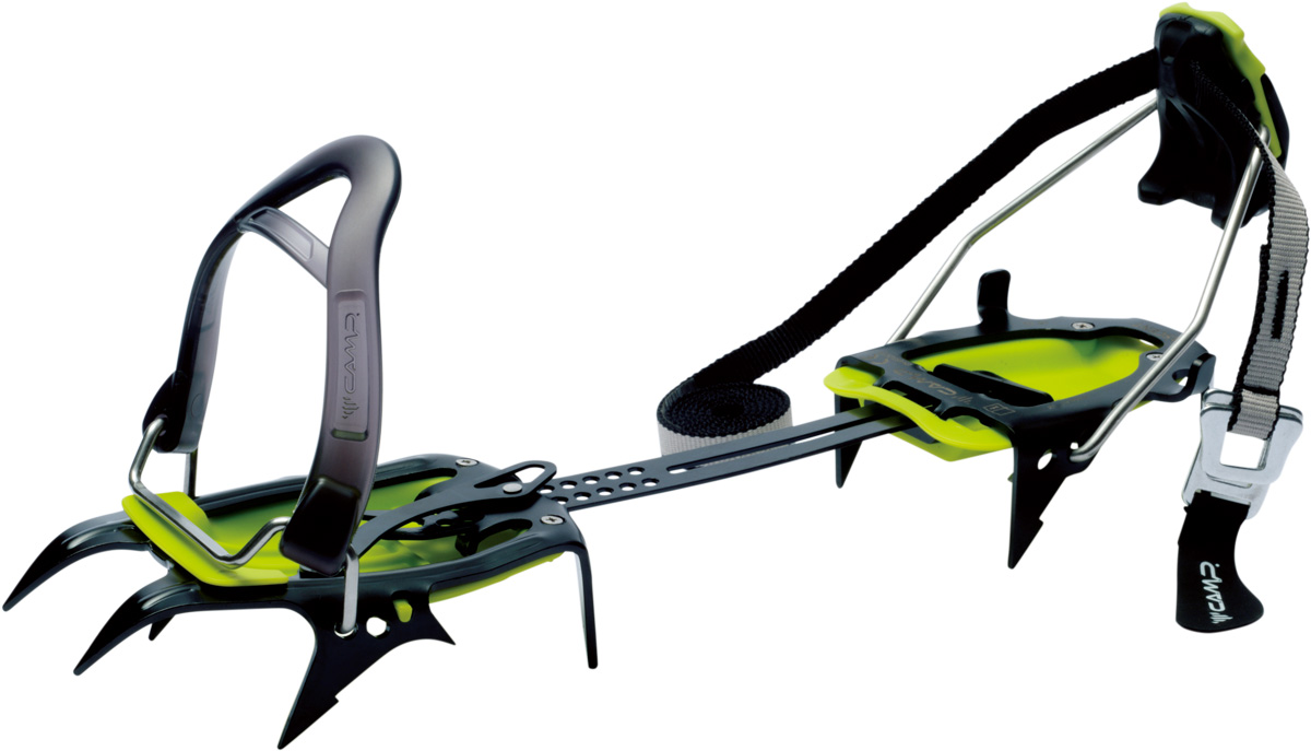 クロモリ鋼の一枚板で製造される剛性の高さが特長のモデル。クランポンの周囲をL字断面のリブ状に加工し、軽さと剛性を両立している。左右それぞれの専用設計で爪が適切に氷雪面をとらえてグリップ。