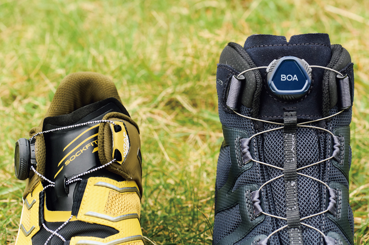 そこで活用したいのが、ダイヤルで素早く最適なフィット調節を行なえるBOAフィットシステムだ。とくに2018年に開発されたBOAパフォームフィット・ラップ構造は、パフォーマンスアップも期待できるもの。今回集めた6足のうち4足がラップ構造を採用。とはいえ従来構造のBOAでも登山道を登る運動レベルなら、十分に機能を発揮する。