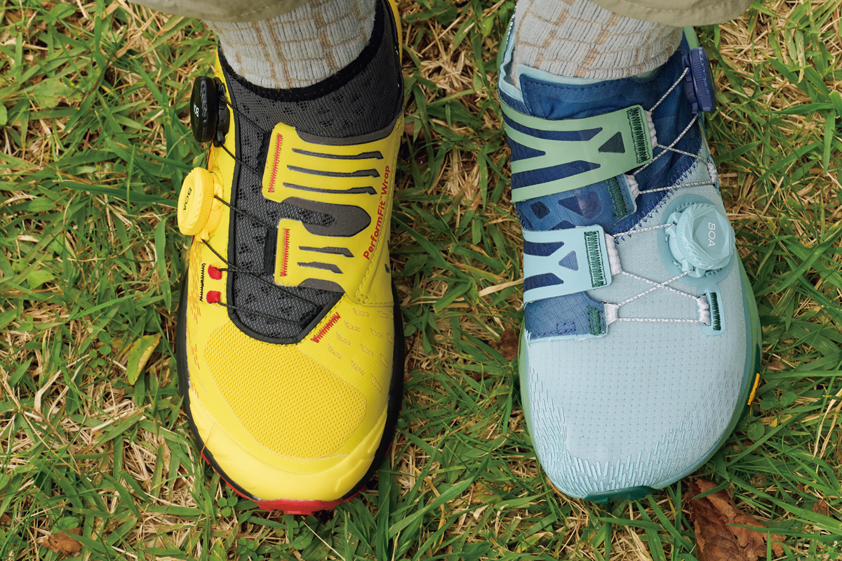 紐靴のミッドカットなどのシューズは、靴紐を締めて足首を固定する仕様。でも最近はテント泊でも12〜13kg程度の装備が可能。そうなるとがっちりしたアッパー素材で固定して動きを制限するよりも、シューズと足との一体化によって安定感が出て、かつ動きやすいシューズのほうが身体の負担が軽くなると筆者は考えている。今回紹介している6足は、まさにそんなシューズだ。一体感を生むBOAは、紐靴同様にレースを配した従来型BOAと、複数本のパネルで甲を包むBOAパフォームフィット・ラップ構造がある。後者がフィット感は高いが、登山使用なら好みで選んで問題ないレベルだ。