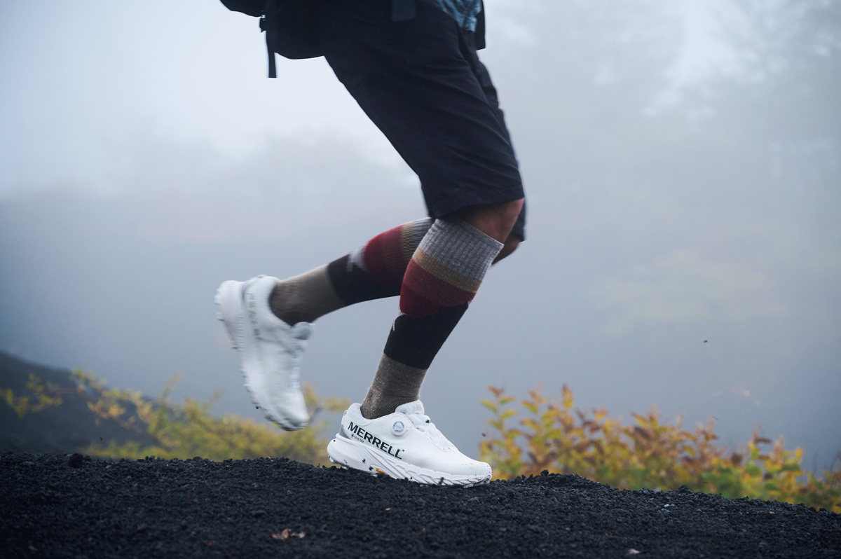ダイヤルを回して締め込むと、中足部だけでなく、履き口も絞り込まれる360ラップシステムを採用。履きはじめは足首周辺の硬さが気になるも、次第にホールド感に変わっていく。高所を走るスカイランニングに対応し、ソールを含めたシューズの剛性感が高く、トレッキングシューズ的。ドロップ4mmで、安定感のある動きが可能だ。