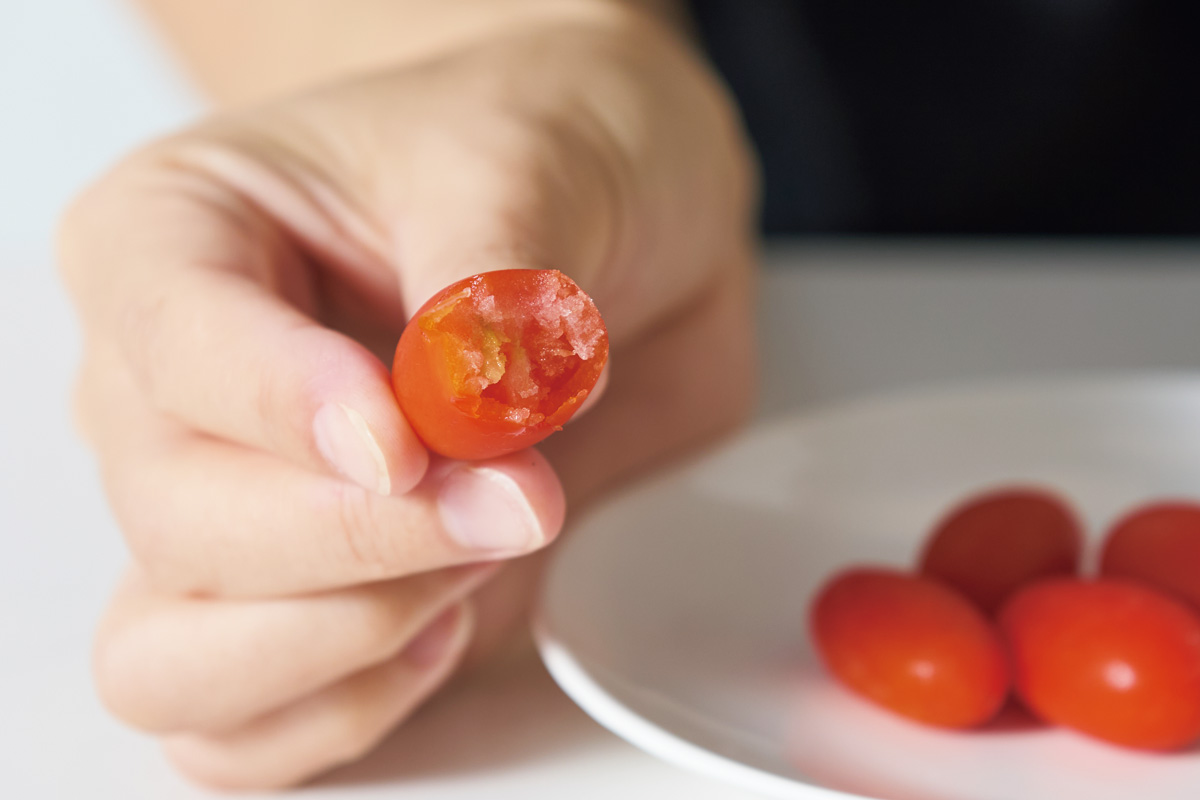 脂肪分の多い食材、糖分多めの食材をチョイス。「甘味と塩味を織り交ぜた総じて食べやすいカテゴリー。とくにサラミとベビーチーズは少し凍らせ気味にしても相変わらずおいしくて好感触」(小池)。「魚肉ソーセージが凍らないことに驚き。オダマキ御用達のベビーチーズは凍っている? 感じだけどパキッと割れて食べやすい!」(オダマキ)