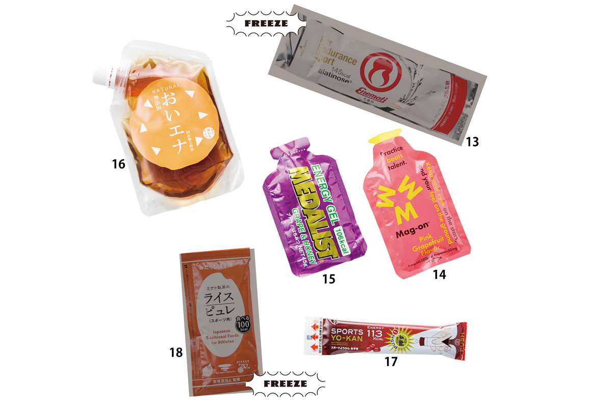コンパクトな形状で高カロリー摂取できる品々。お米系が凍ったとも言い難い食感になり風味も落ちてしまった。スポーツようかんは出しにくく食べづらい結果に。「凍らなかったものは“冷たさ”がプラスに働いて、常温よりもスムーズに口当たりよく補給できた。開け閉め自在な点やおいしさなどから、おいエナがもっとも好印象でした」(小池)