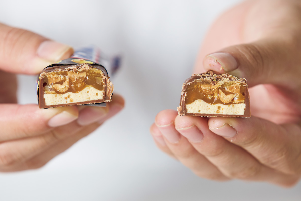 意外だったのがスニッカーズ。糖分が高く粘度も高いキャラメル部分がカッチカチに。歯が折れます。