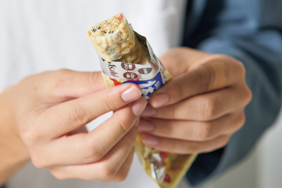 かたまってしまったせいか、手の熱でとけて噛めるものの、おいしいと評判の補給食も微妙な味に……。