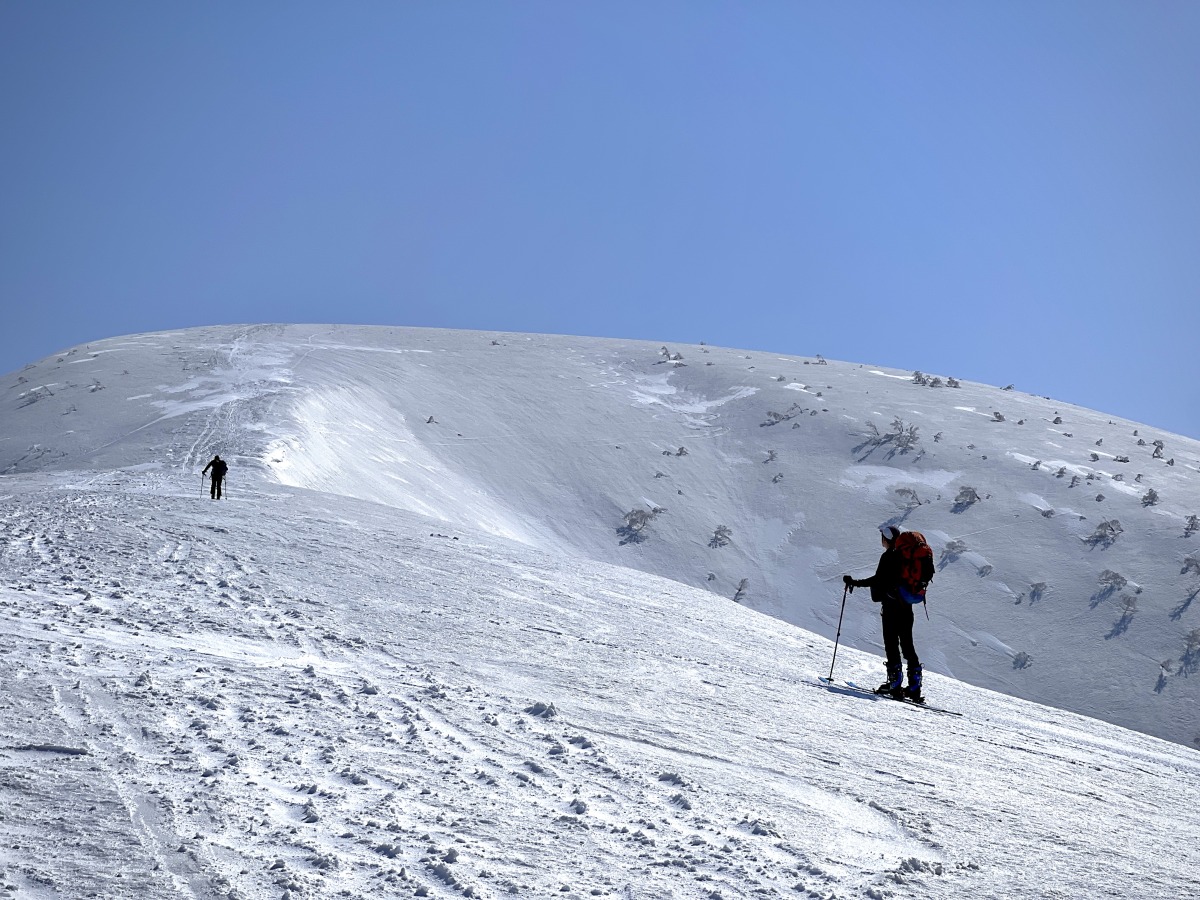 人もまばらで、非圧雪エリアの雪もサラサラとしていて心地がいい。気持ちよく何本もスノーボードで滑るうちにだんだんと奥まで入ってしまい、「このトレースまでは大丈夫だろう」とついて行ったら、なんとそれはスキーのトレース……。谷の深いところまで行く前に尾根を乗っこしているではないか。