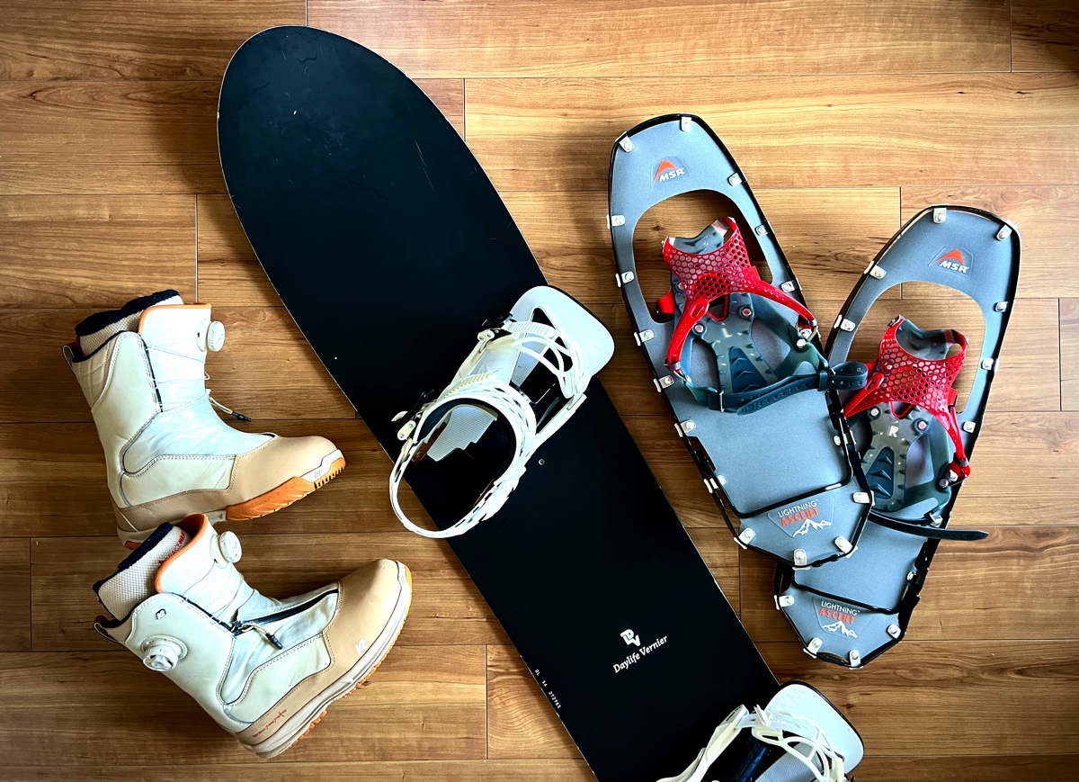 スキーの場合、ツアーモード機能付きのビンディングを使用すると、登行時にカカトが上がり歩きやすくなる。スノーボードの場合は、スプリットボードを使用するか、ソリッドボードではスノーシューを併用する。
