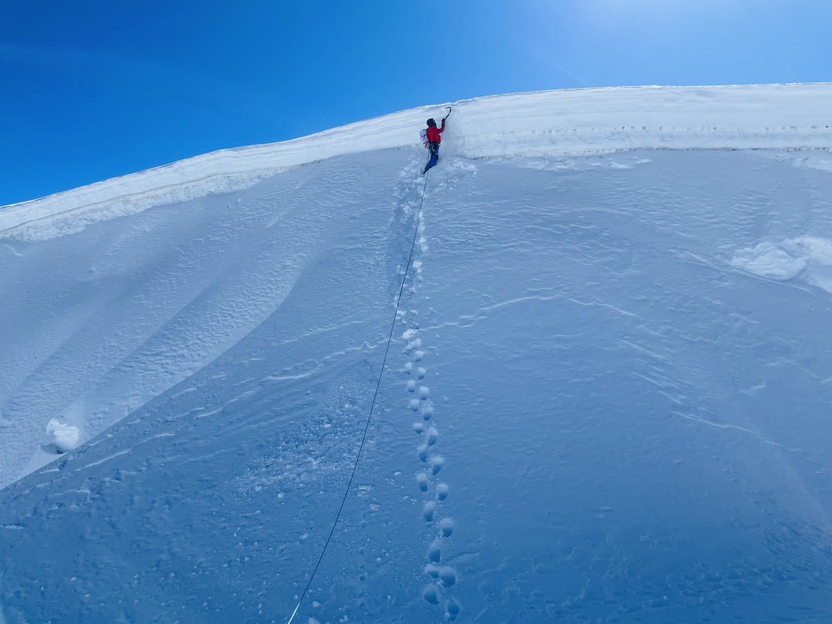 丘をほぼほぼ登りきるところまでくると埋没しかけているクレバスの端に出た。金子君が対岸から見たときに気にかけていた部分だ。繋がっていないかもしれないという予想は当たってしまったのだ。回り込もうとすると、スカスカの雪の心もとない斜面を横切らなければならず、傾斜もそれなりにあって雪崩のリスクも高い。ここには行けない。そうなると、埋没したクレバスを渡り、その先の反り上がった垂直の雪壁を2mほど登る必要があった。「ここでクライミングか……」私は内心そう思っていた。すでにチーム全体の体力が削られていること、そして大幅に時間が押していること、そんななかで時間のかかるクライミングはいい知らせではなかった。