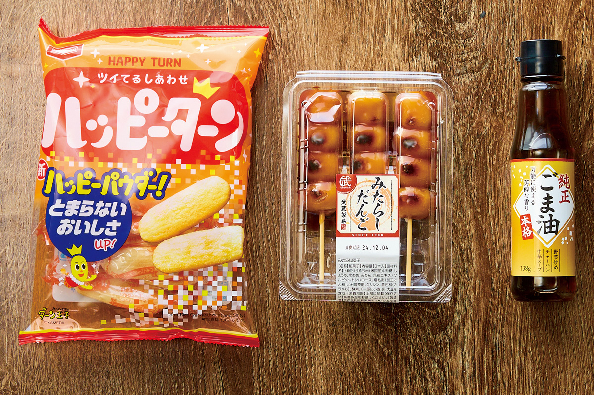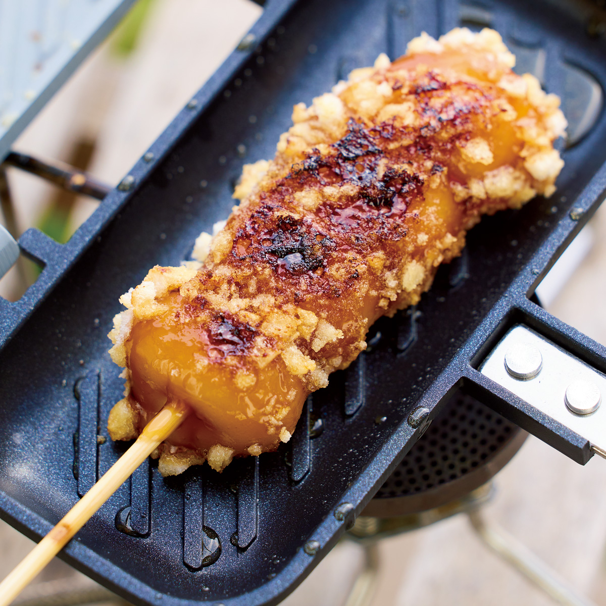 チャック付きのビニール袋の中でハッピーターンを粉々に潰し、そこへみたらし団子を入れて団子のまわりに絡ませる。まんべんなく団子にまぶしたら、ごま油を引いたホットサンドクッカーでプレス。両面こんがりと焼き上げれば完成!