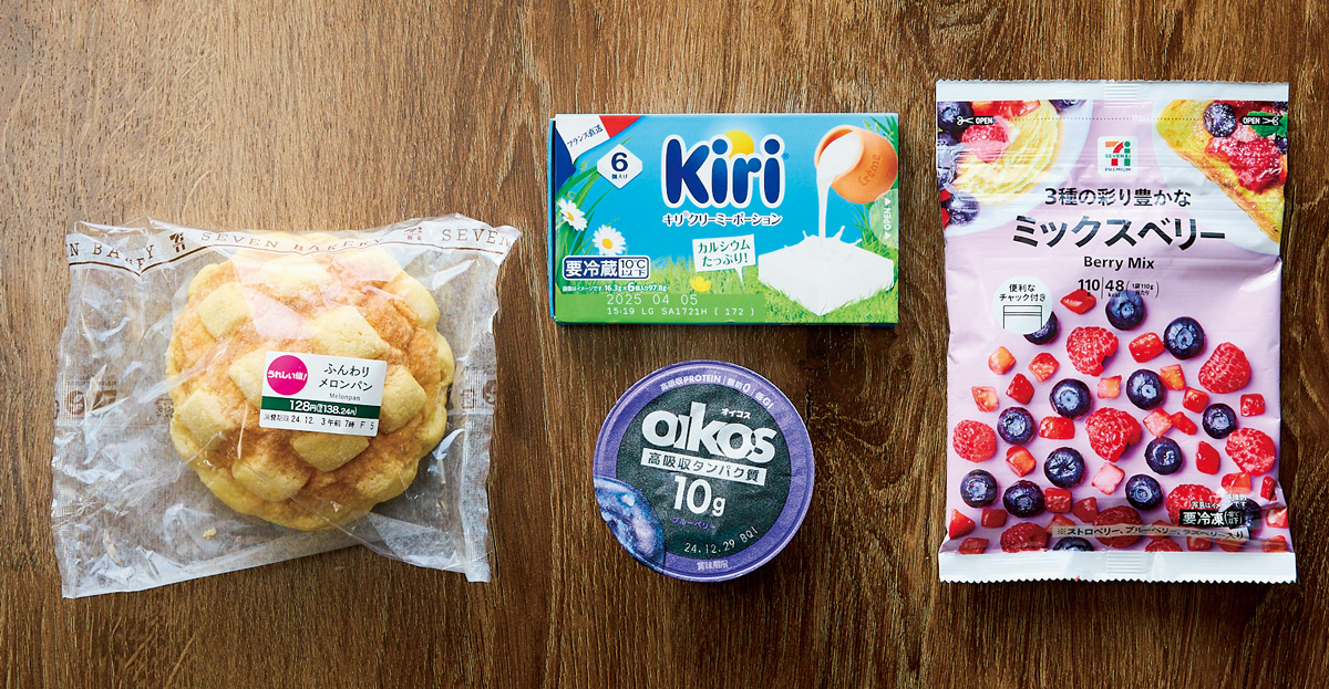メロンパンを横半分にスライスし、あいだにクリームチーズと冷凍ミックスベリー、ブルーベリーヨーグルトを挟んでクッカーでプレス。メロンパンの表面がジュワッと溶けて甘い香りが漂ってくるぐらいに両面こんがり焼き上げればできあがり。