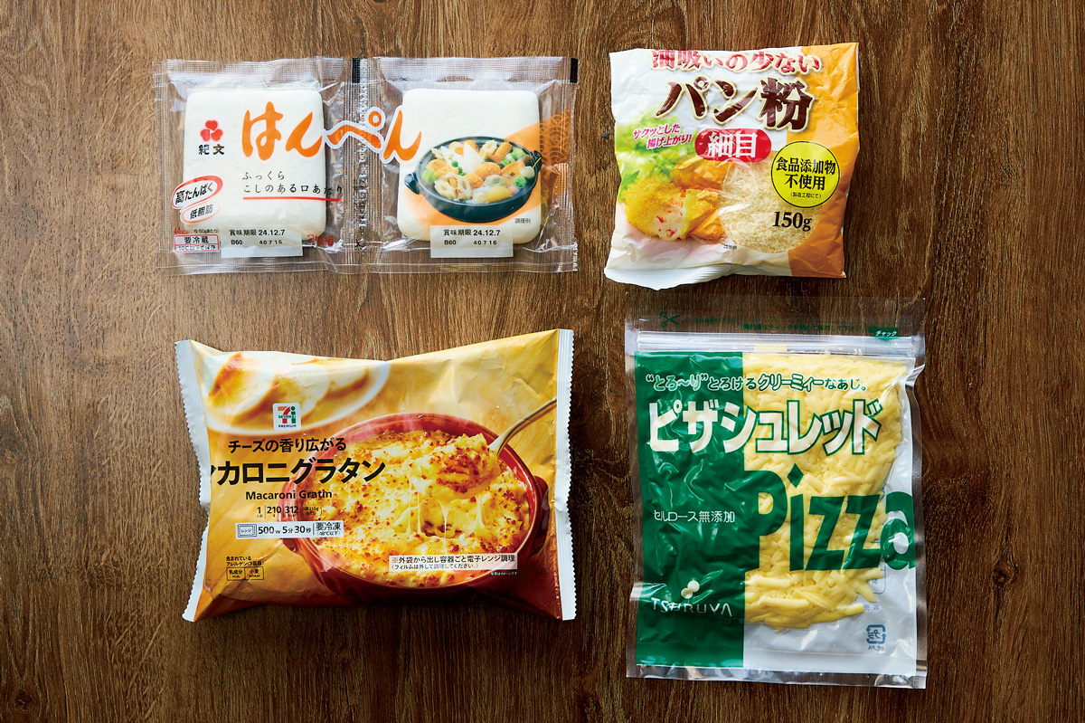 チャック付きビニル袋などにはんぺん2枚を入れて片面ずつにパン粉をまぶす。クッカーに油を引き、その上にパン粉が付いた面を外側にし、はんぺんを置き、冷凍マカロニグラタンとピザチーズをあいだに挟む。プレスして両面をしっかり焼き上げれば完成。