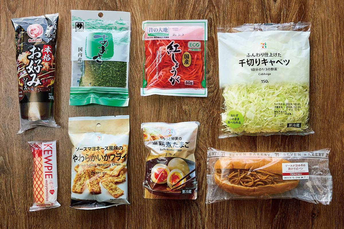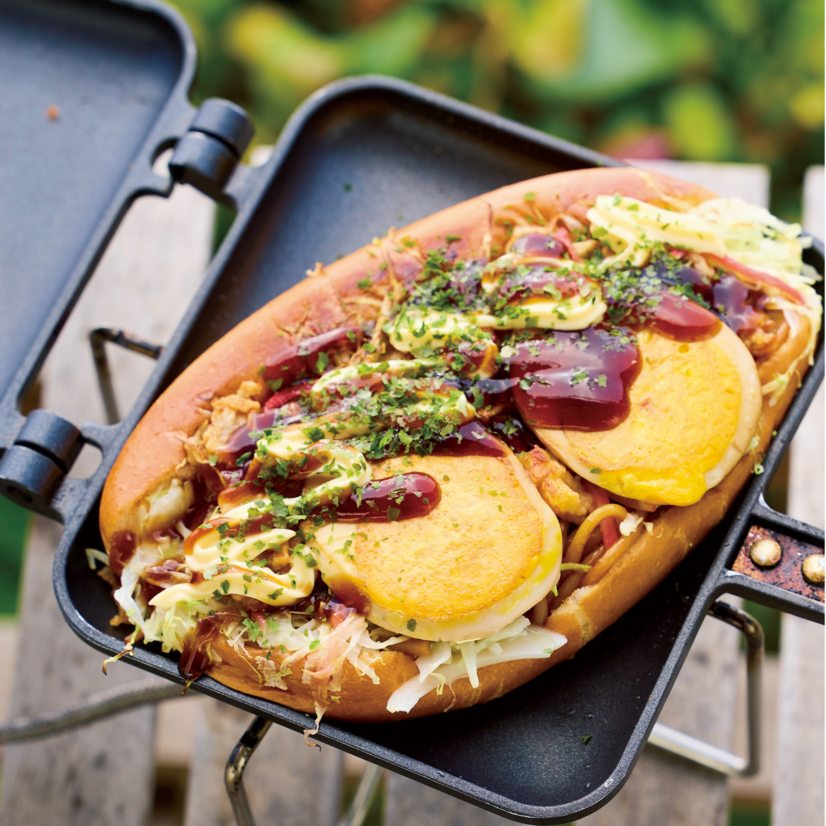 焼きそばパンに千切りキャベツ、イカフライ、紅ショウガ、半熟煮たまごをトッピングしてクッカーでプレスして両面焼く。焼き目がついたらマヨネーズ、お好み焼きソース、青のりをたっぷりかけて味を濃いめに仕上げればお好み焼き度アップ!