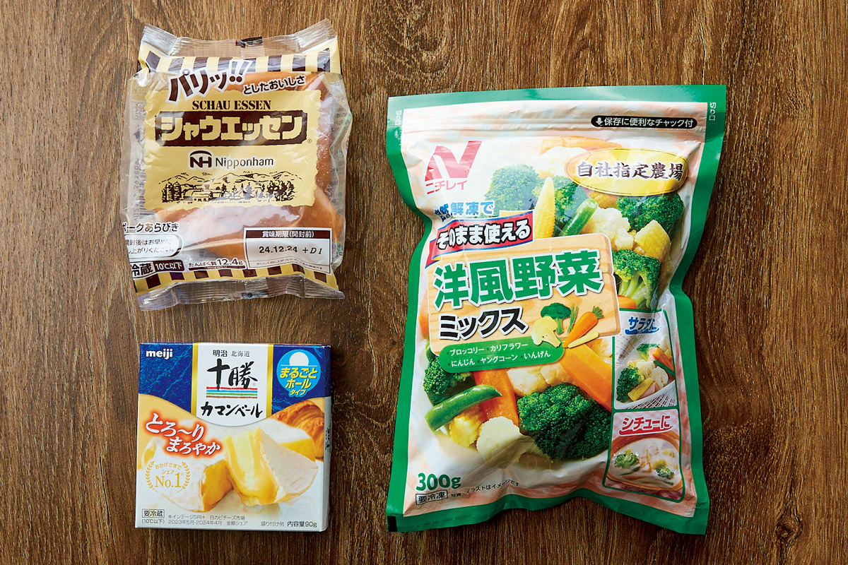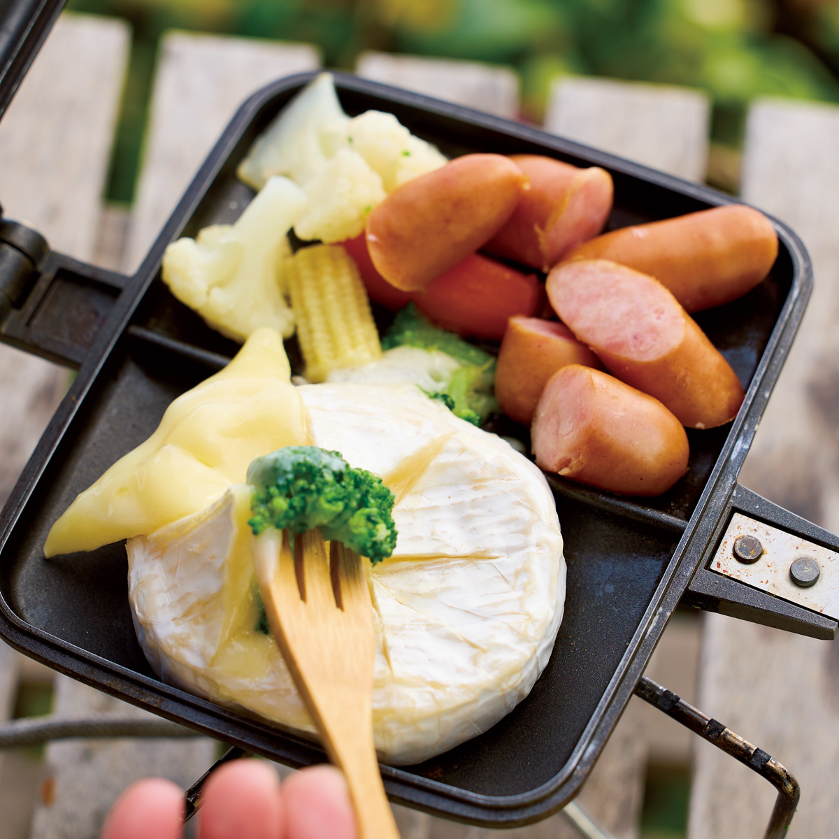 カマンベールチーズに十字に切れ目を入れ、ウィンナーはひと口サイズにカット。片方にチーズ、もう片方にカットしたウィンナーと冷凍ミックス野菜を入れ、フタをして火にかける。具材が蒸されてチーズがとろければ食べごろ。ディップしてめしあがれ!