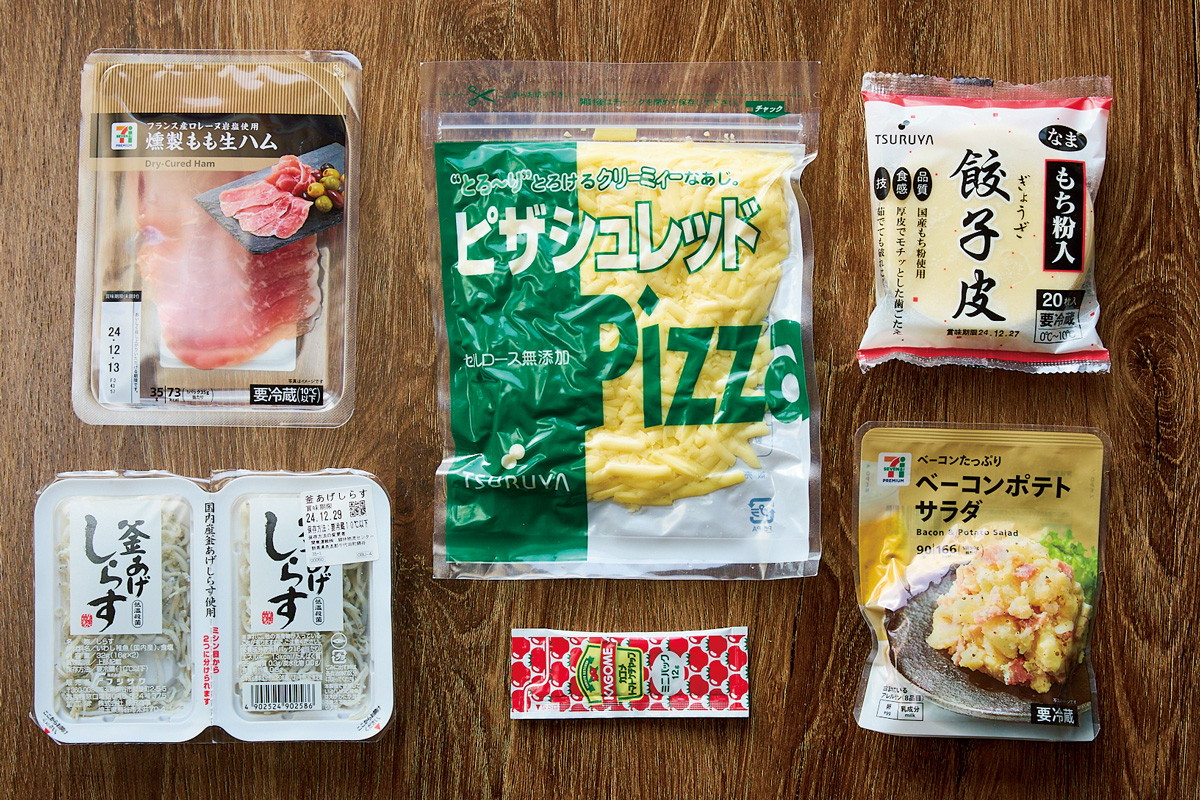 薄く油を引いたホットサンドクッカーに餃子の皮を4枚並べ、片方にはベーコンポテトサラダとトマトケチャップ、もう片方には生ハムとしらすをトッピングし、その上からたっぷりピザチーズをかけて餃子の皮4枚でフタをし、両面カリっと焼き上げて。