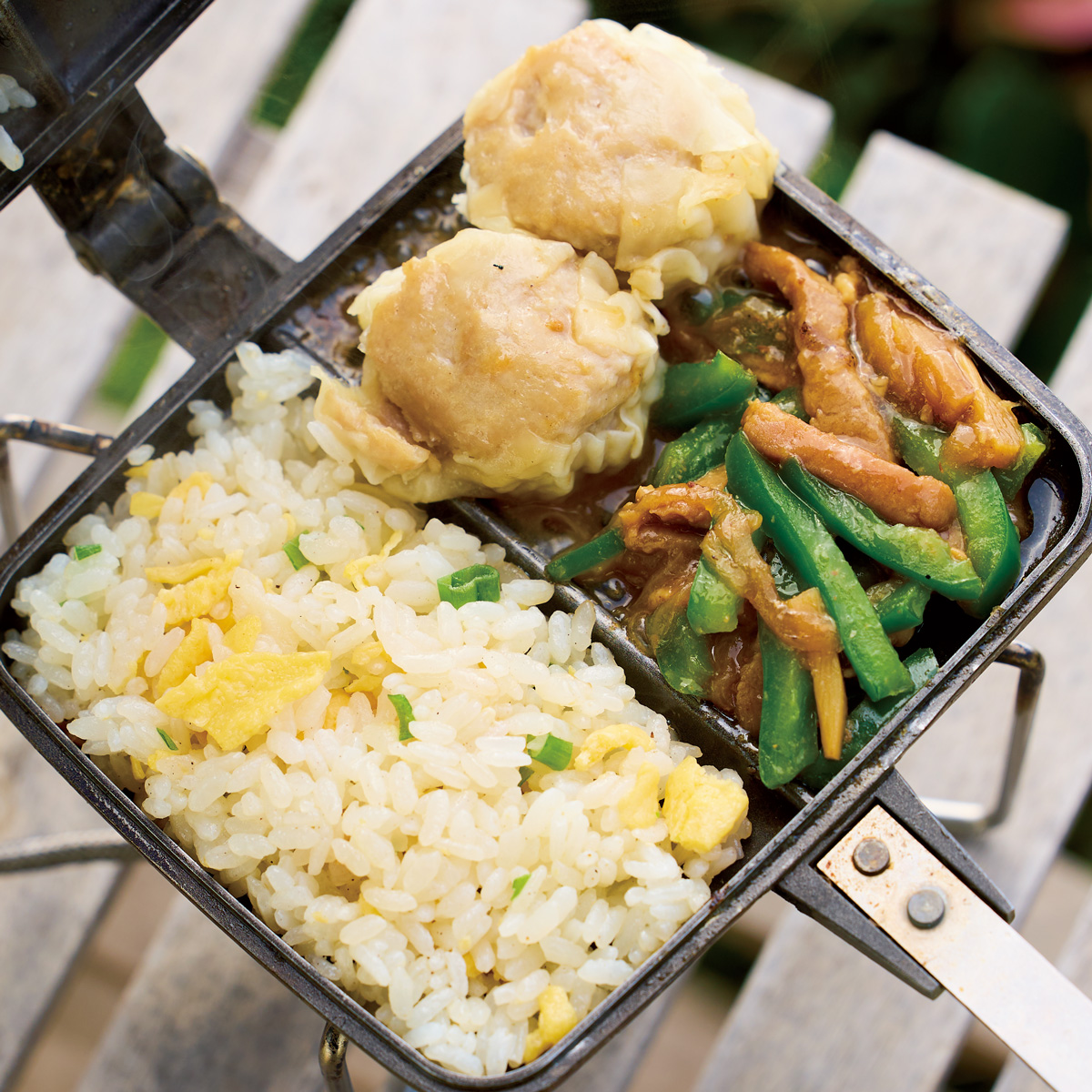 片方には冷凍チャーハン、もう片方には冷凍チンジャオロースーとシュウマイをセットしてフタをして火にかけるだけでホカホカ弁当のできあがり。すべてコンビニでそろえられるし自宅であらかじめ詰めてくればゴミも出ず、荷物もコンパクトになるよ。