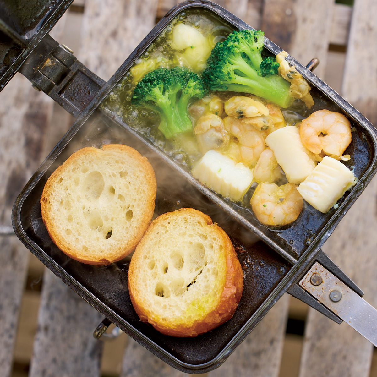 ニンニクを小さくカットしクッカーの片方にオリーブオイルといっしょに火にかけ冷凍ブロッコリーとシーフードミックスを加える。もう片方にはスライスしたバゲットを並べ、手でひっくり返して両面焼き上げる。アヒージョがぐつぐつしてきたら食べごろ。