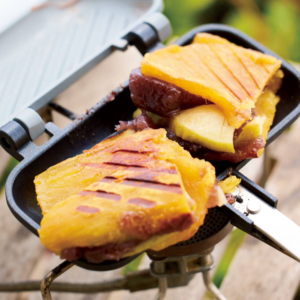 皮を剥き薄くスライスしたリンゴとミニ羊羹を干し芋でサンドしホットサンドクッカーでプレス。表面に焼き目がつくぐらい両面焼き上げて。ほくほくアツアツのサツマイモの甘みと濃厚な羊羹、シャキシャキリンゴのコラボレーション!