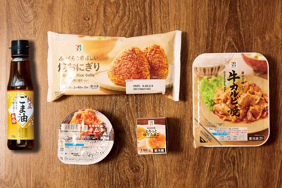 クッカー内にごま油を引き、冷凍焼きおにぎりを置く。さらに冷凍牛カルビ焼きとキムチをトッピング。クッカーのフタをして両面じっくり焼き上げれば完成! こんがり焦げ目がつくぐらいしっかり焼けば香ばしさ満点。コチュジャンをプラスするのもおすすめ。