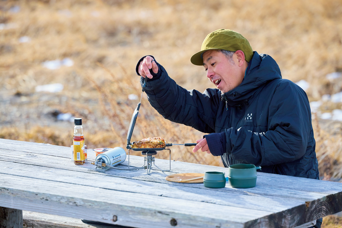 登山のあらゆるシーンでホットサンドクッカーを駆使し、おつまみからメインディッシュまで手がけ同行者のお腹を満たしてくれる敏腕カメラマン。