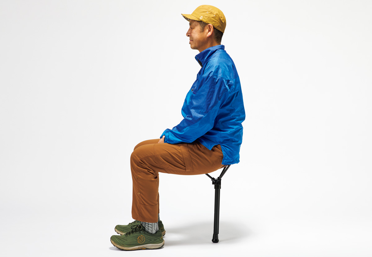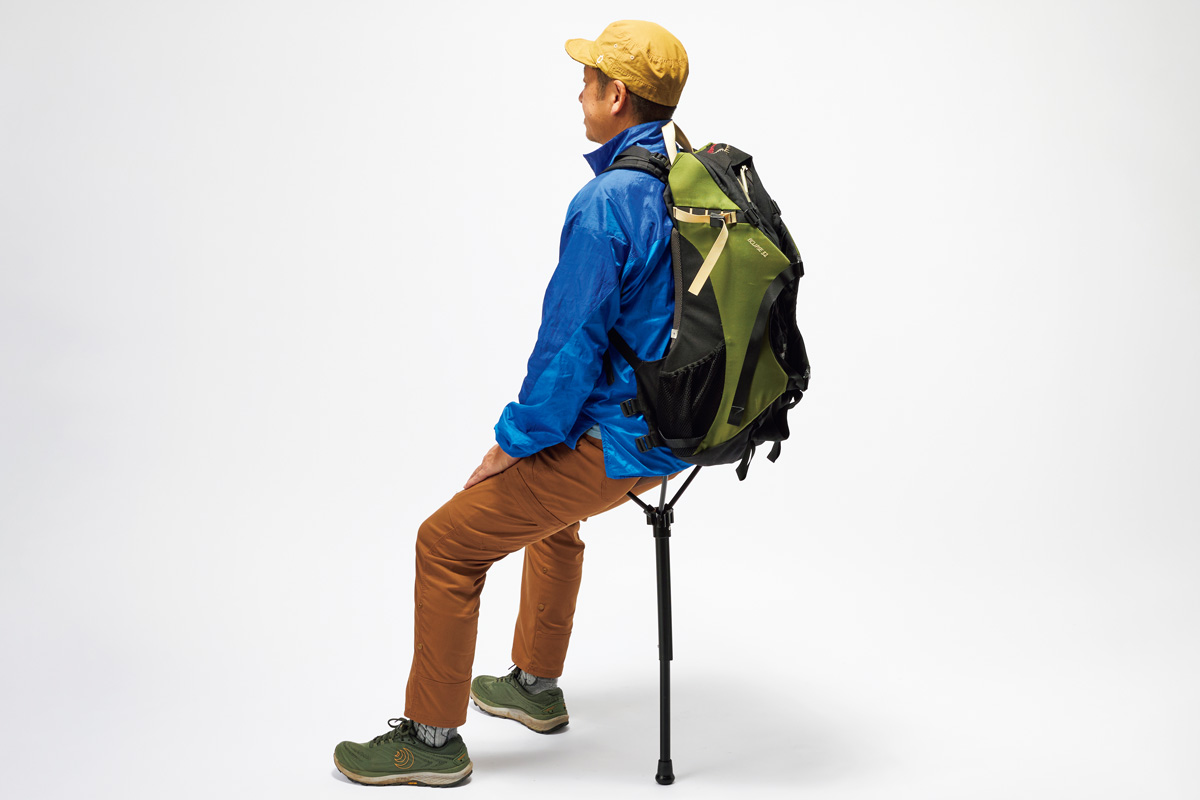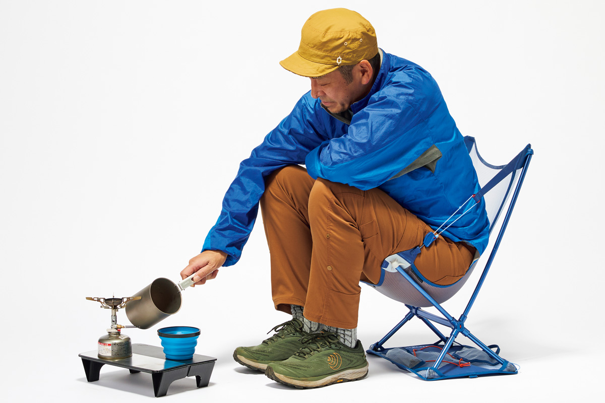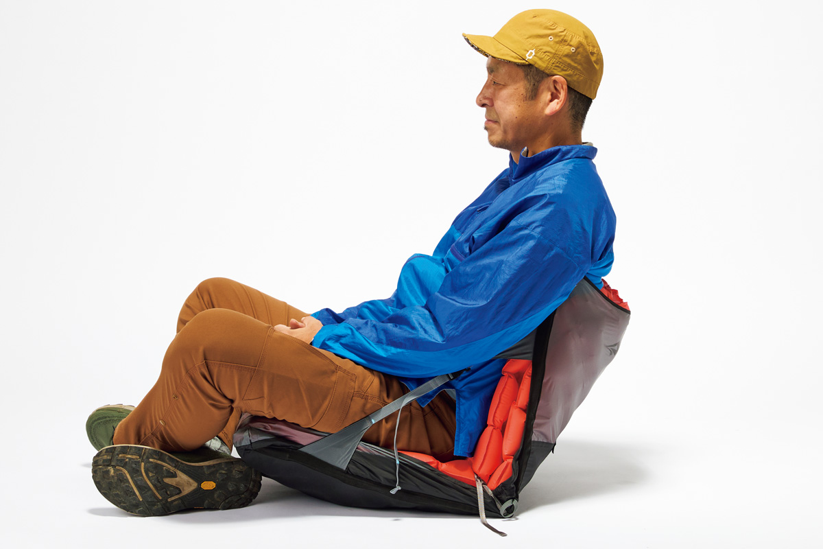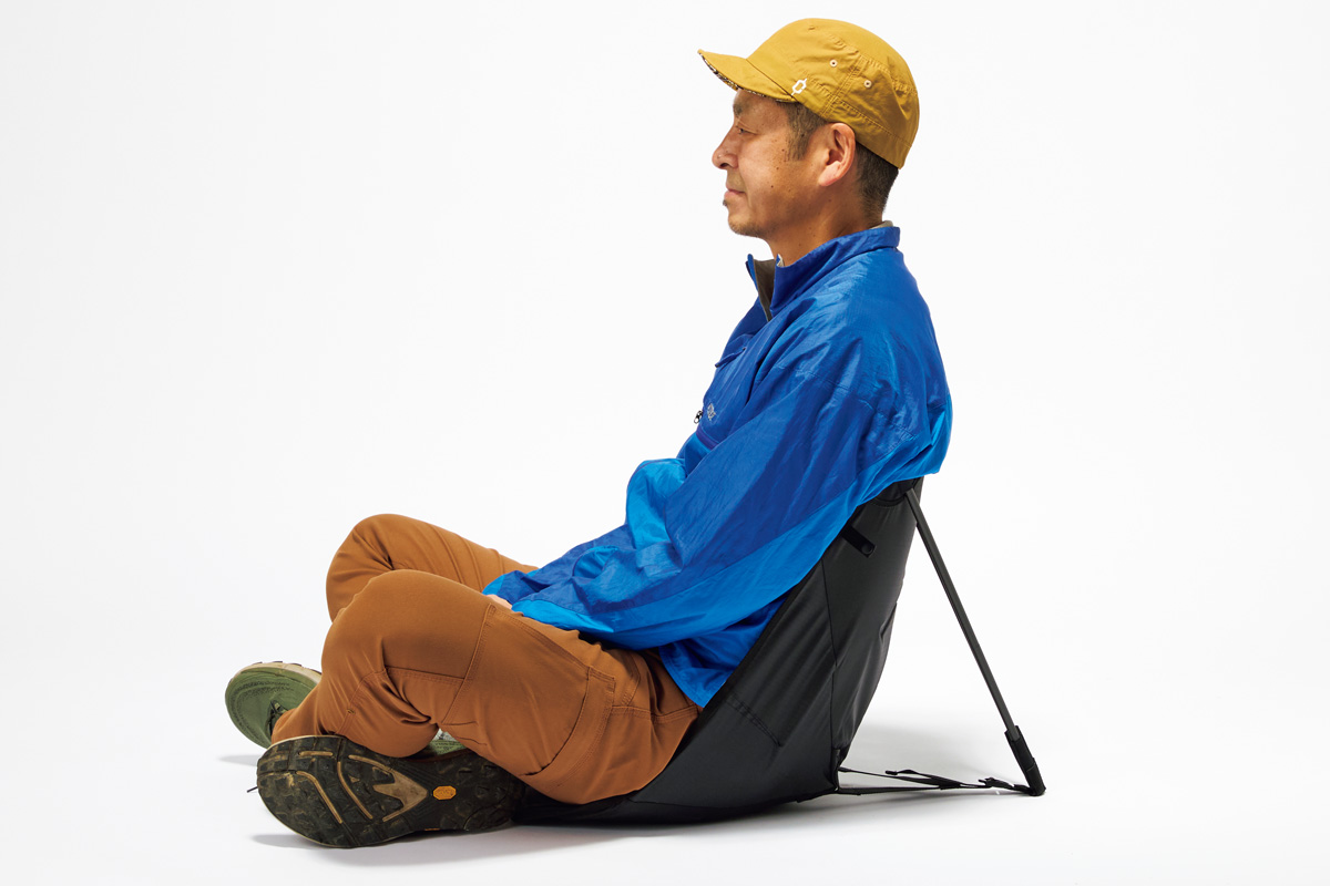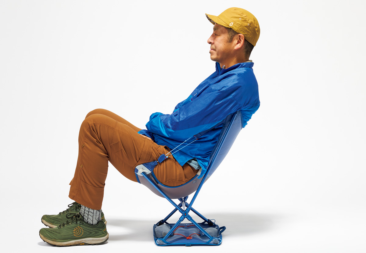 ムダを削ぎ落した道具の多くは、使い手のアイデアや経験値によって、使いやすさを補完する仕様になる。それが山道具を使う楽しさでもあるが、最近はつくり手がシンプルさのなかにアイデアを盛り込んだモノを生み出してくれる。座る道具として今回もっとも楽しかったのは、ロゴスの一脚だ。平均的身長の男性がちょっと腰掛けるのにちょうどいい74cmという通常のチェアの倍以上ある座面高に、安定感と驚きを感じた。フィールドレコードの座椅子も、通常は背もたれ内にあるフレームを外に出して、角度調節も可能にするギミックに感心した。