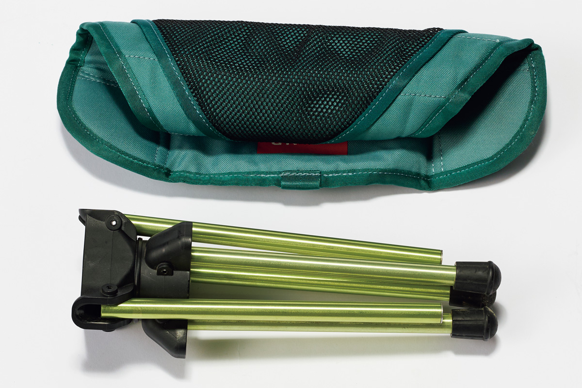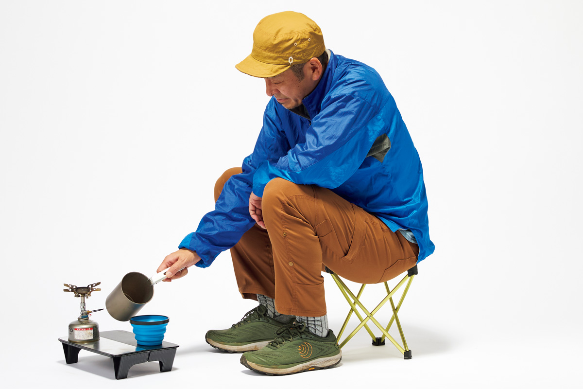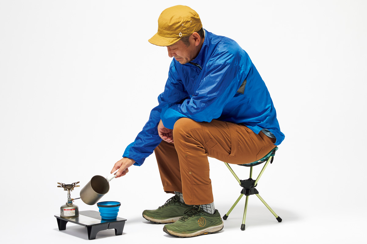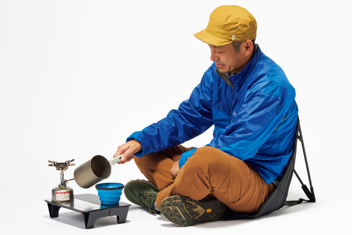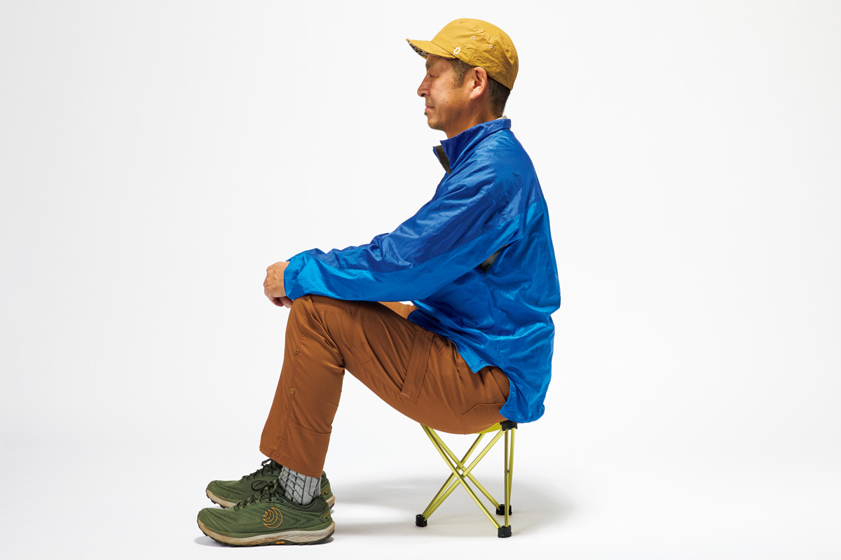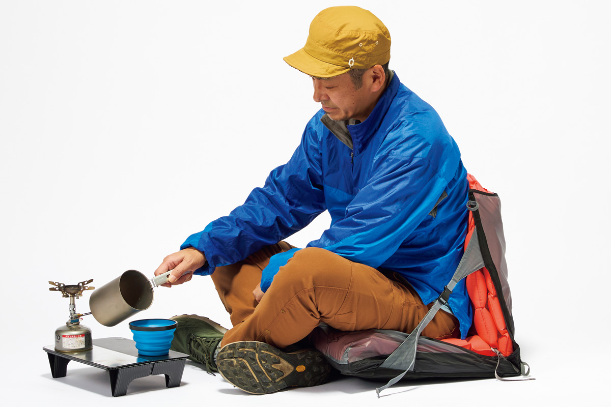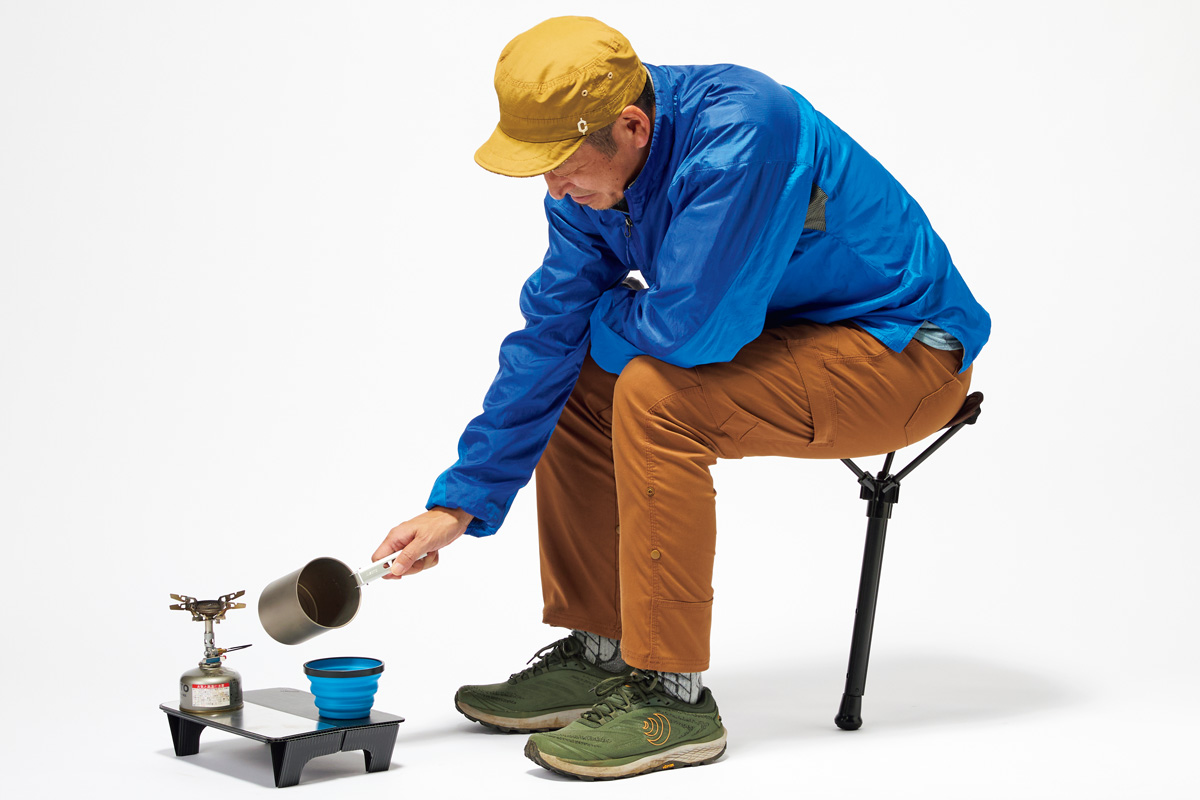 ムダを削ぎ落した道具の多くは、使い手のアイデアや経験値によって、使いやすさを補完する仕様になる。それが山道具を使う楽しさでもあるが、最近はつくり手がシンプルさのなかにアイデアを盛り込んだモノを生み出してくれる。座る道具として今回もっとも楽しかったのは、ロゴスの一脚だ。平均的身長の男性がちょっと腰掛けるのにちょうどいい74cmという通常のチェアの倍以上ある座面高に、安定感と驚きを感じた。フィールドレコードの座椅子も、通常は背もたれ内にあるフレームを外に出して、角度調節も可能にするギミックに感心した。