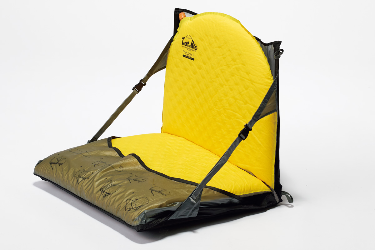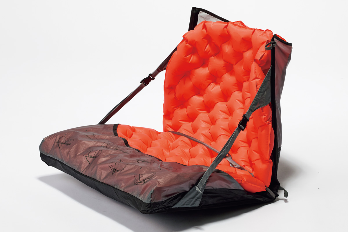 スリーピングマットをセットする座椅子。シートゥサミットの重量は230g。エアマットのレギュラーサイズだと400gをプラスして合計600gをオーバー。でも幅55cmまでのマットならセット可能なので、クローズドセルマットや座面だけになるがシートマットにすれば50~100g程度のプラスですむ。ぜひ使い分けを!