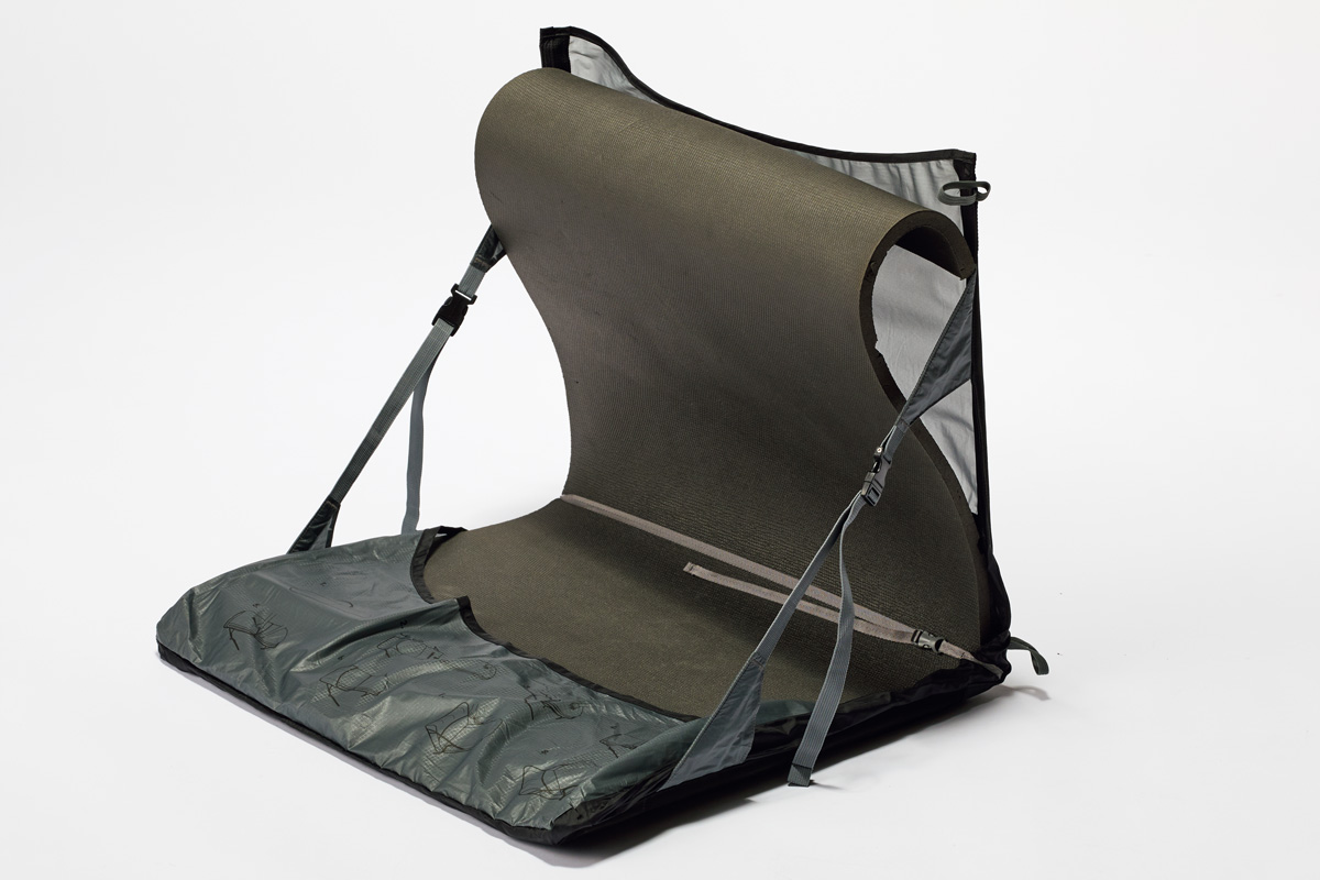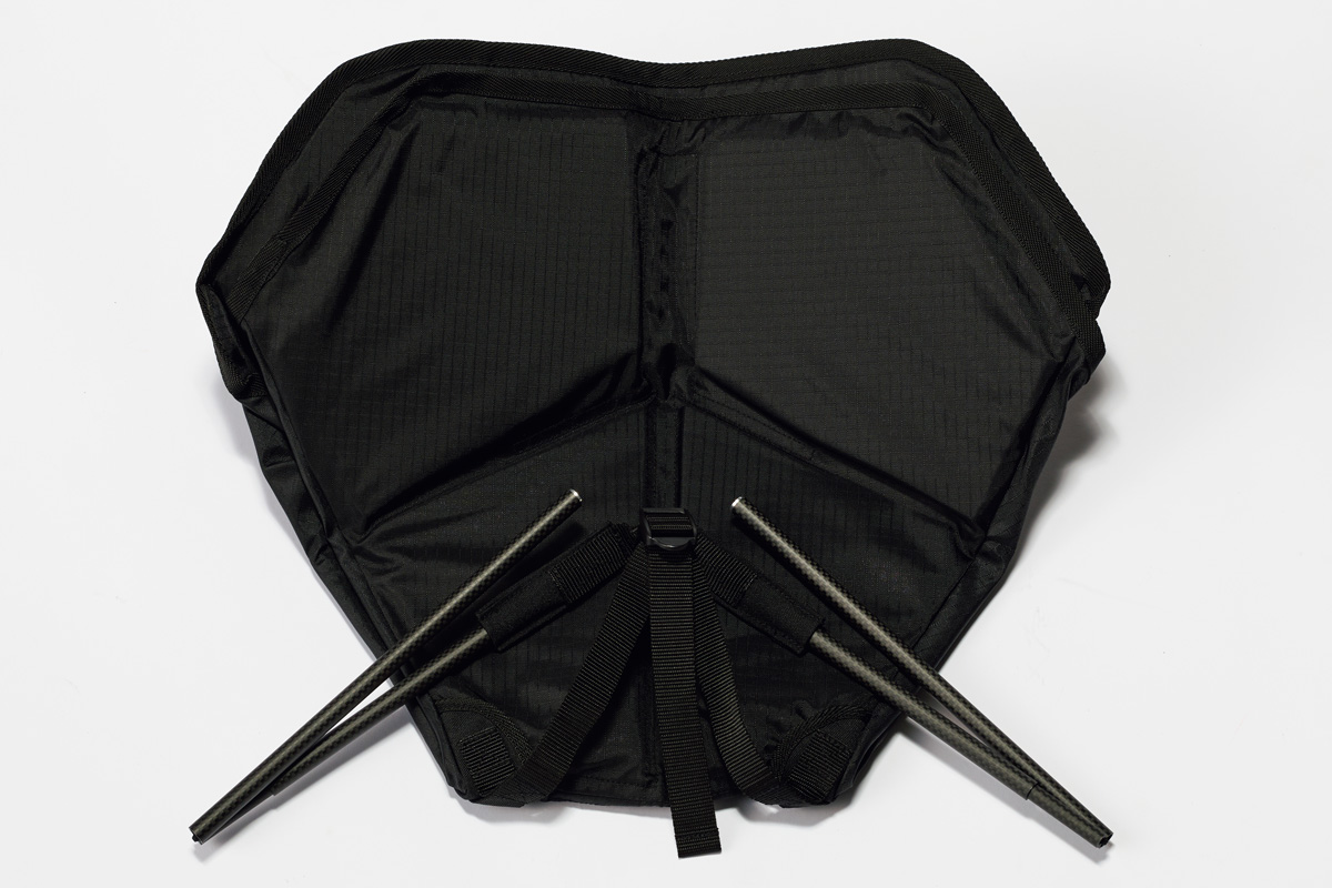 背もたれの後ろのカーボンフレームをX字に配せば安定感が増すが、軽量化のために、あえてバランスと体幹を使うV字型を採用したというアウトドア用座椅子。いっぽうで熱反射素材をライニングして冷えを抑えた座面、その座面と連結したストラップ長を調節すれば、リクライニングも可能。ただ軽いだけではなく、座り心地のよさも追求した意欲作だ。