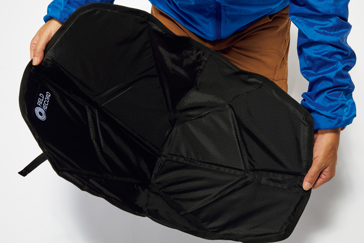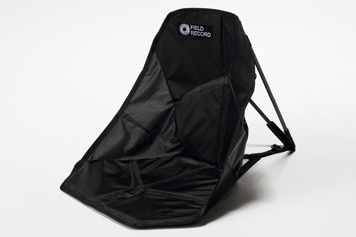 フィールドレコードは、かさ張るクッション入りの座面に折り目を付けて収納時のコンパクト化を実現。背後のストラップとフレームを連結させ紛失も防止!