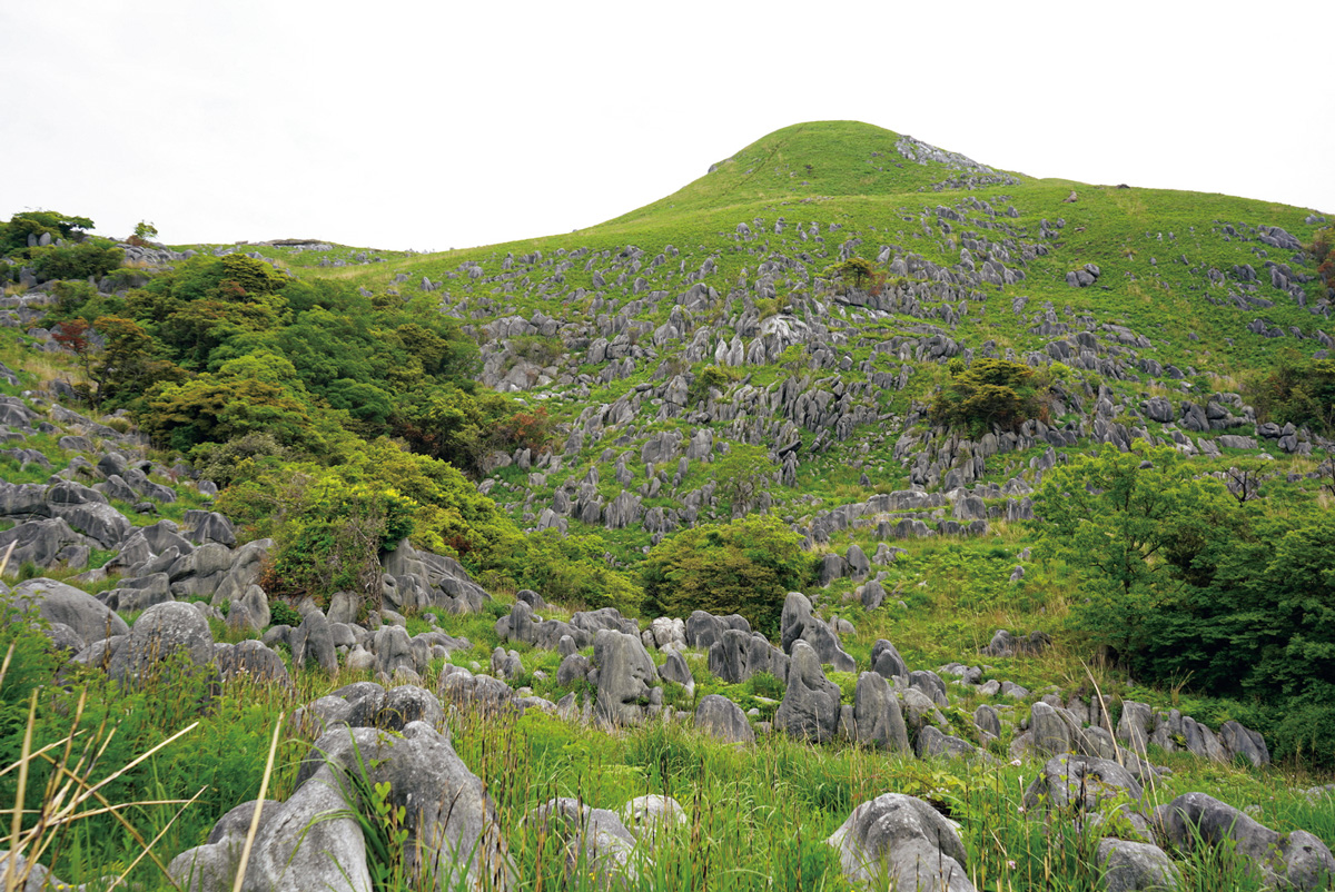 カルストとは、 珊瑚礁由来の石灰岩が長い間の地殻変動を経て隆起し、地表に露出したものが雨水や地下水などで侵食されてできた地形のこと。一見、岩がそこらじゅうに転がっているように見えるが、地上から顔を出している状態でこれをピナクルと呼ぶ。平尾台のピナクルは丸みを帯びているのが特徴。数も多く密集しており、まるで高原に羊が群れているように見えるため「羊群原」と呼ばれている。間近に見る羊群原は圧巻だ。