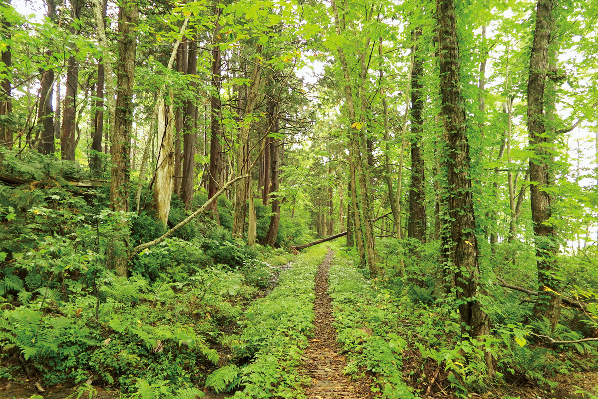 根場集落を20分ほど歩き登山口へ。杉林を進めば、木々の合間から富士山が見えはじめ、標高とともにテンションも上がっていく。やがて登山道はブナの原生林に包まれ、しばらくすると雪頭ヶ岳へ到着する。そこに広がるのは文句なしの絶景。南北に連なる天子山地の毛無山〜竜ヶ岳、富士五湖の精進湖、原始が広がる青木ヶ原樹海、そして富士山。ここでランチタイムにすれば最高の調味料になる。