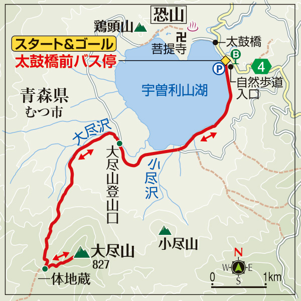 JR大湊線の下北駅から「恐山」行きのバスで45分。登山口への最短は「太鼓橋前」バス停だが、恐山の霊場ならば、もうひとつ先の「恐山」で下車。ここは観光地として駐車場も広い。
