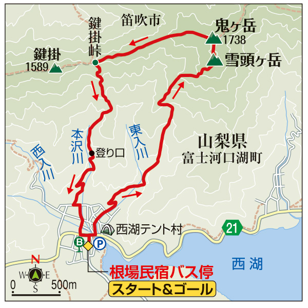 鬼ヶ岳までは20分ほど。山頂は360度大パノラマだ。甲府盆地を囲むように南アルプスと八ヶ岳、振り向けば富士山はもちろん、山中湖や遠く丹沢山系まで望める。 鍵掛峠まではゆったりとした山歩きだが、峠からは急な下りとなるため気を付けたい。下山後、そのまま西湖いやしの里根場でお土産や食事も楽しむと、山の思い出はいっそう深められる。