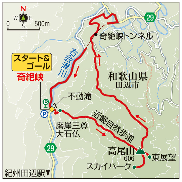JR紀伊田辺駅から龍神バスに乗車して「奇絶峡」で下車。登山口となる不動の滝はすぐ目の前。車の場合は奇絶峡の入口にある駐車場を利用(無料、5台分)。トイレもある。