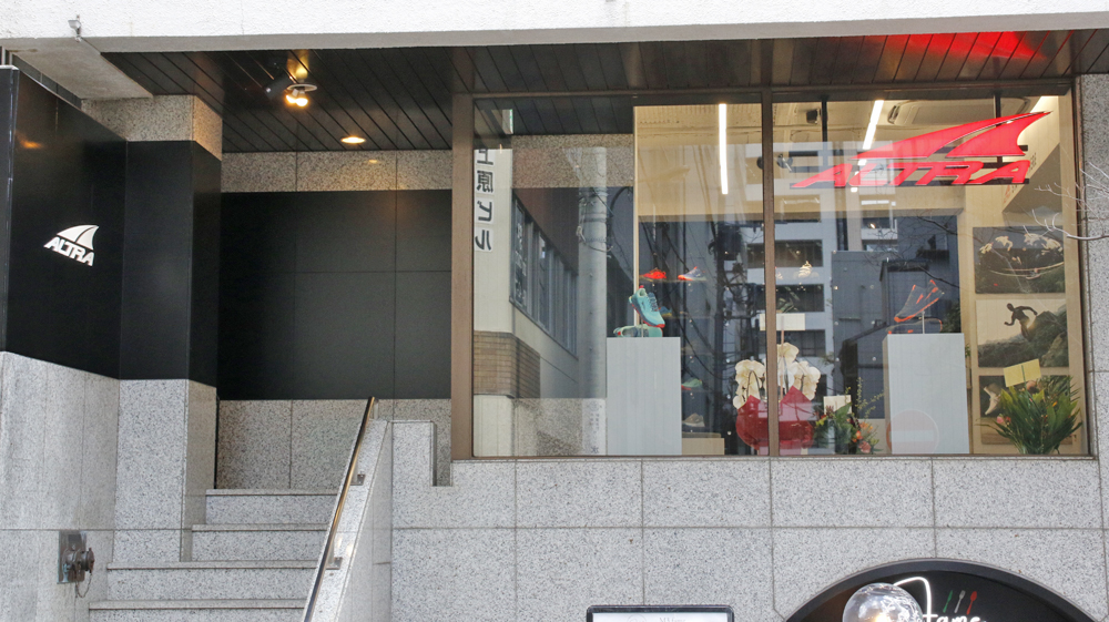 道路から見上げると、ガラス張りの店内にアルトラのシューズが並んでいる様子が見える。