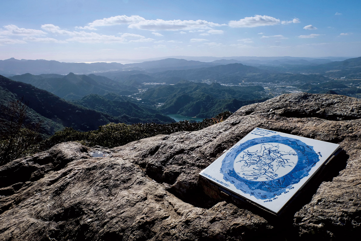 この先が黒髪山の核心部。急な岩場が続くが、鎖やハシゴ、ステップが付けられているので、慎重にいけば問題はない。黒髪山山頂はルートのハイライト。360度展望が開けており、竜門ダムや有田ダム、有田の街並み、さらに伊万里湾や唐津湾など海まで見渡すことができる。ちなみに麓の有田は日本で最初に磁器が作られたといわれている歴史のある町で、山頂には有田焼で作られた地図が埋め込まれている。