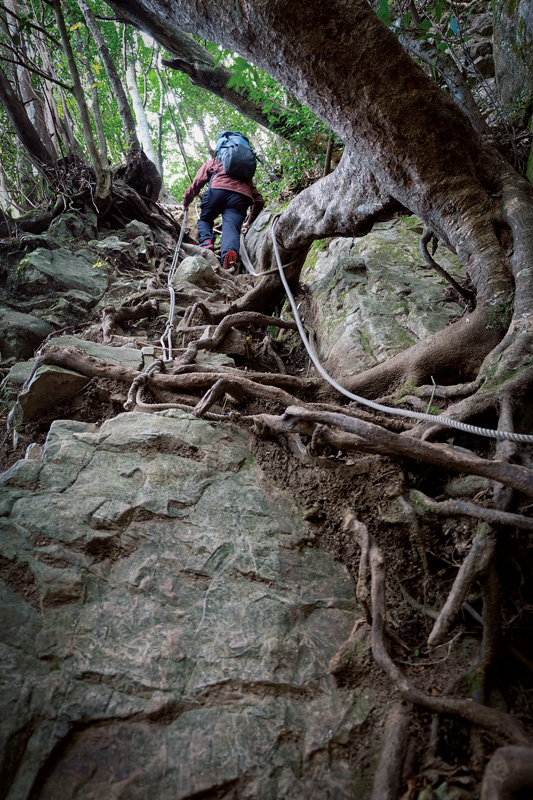 ▲青螺山直下の岩場。ロープが張られているのでうまくバランスを取りながら登ろう。