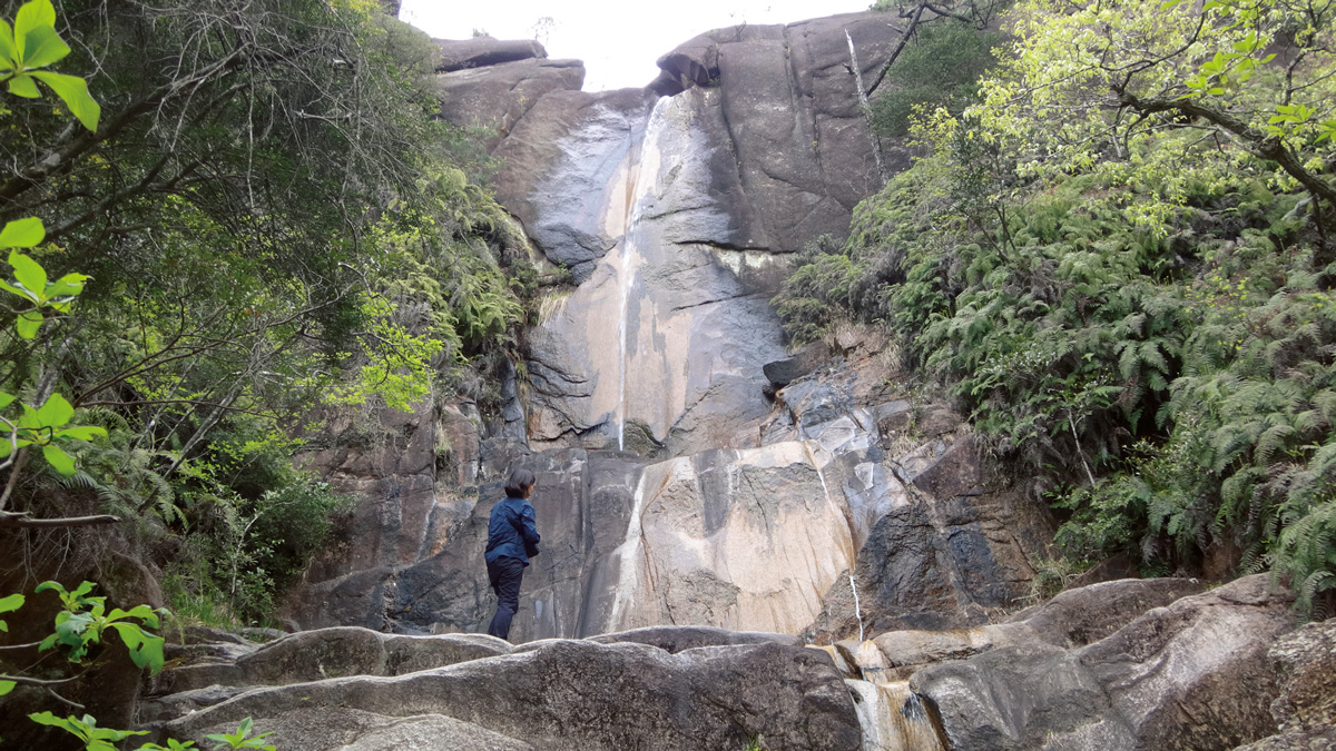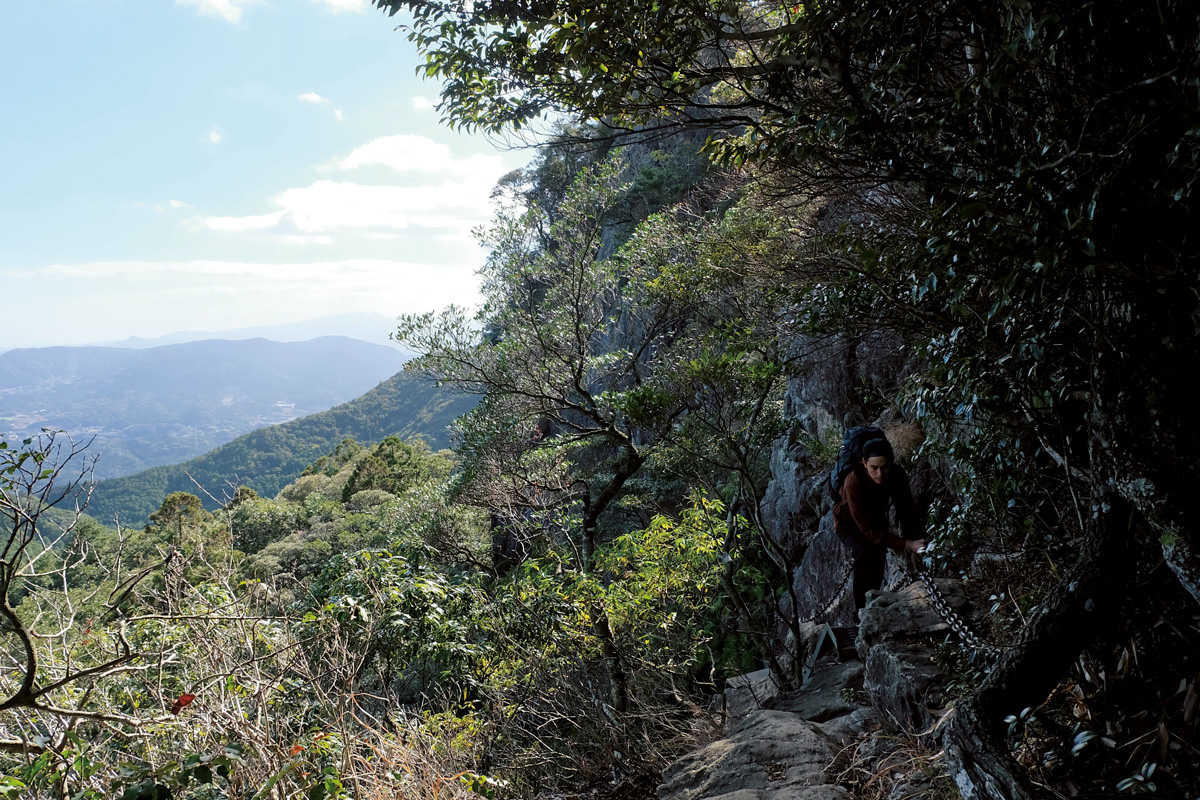 落ヶ滝から稜線までは、おもに沢沿いを行く。シダをかきわけて進んだり、鎖が設置された岩をよじ登ったりと、アドベンチャー気分が味わえる。稜線上は絶景スポットが続き、風化花崗岩の岩塔や巨岩が林立するなかを進む。
