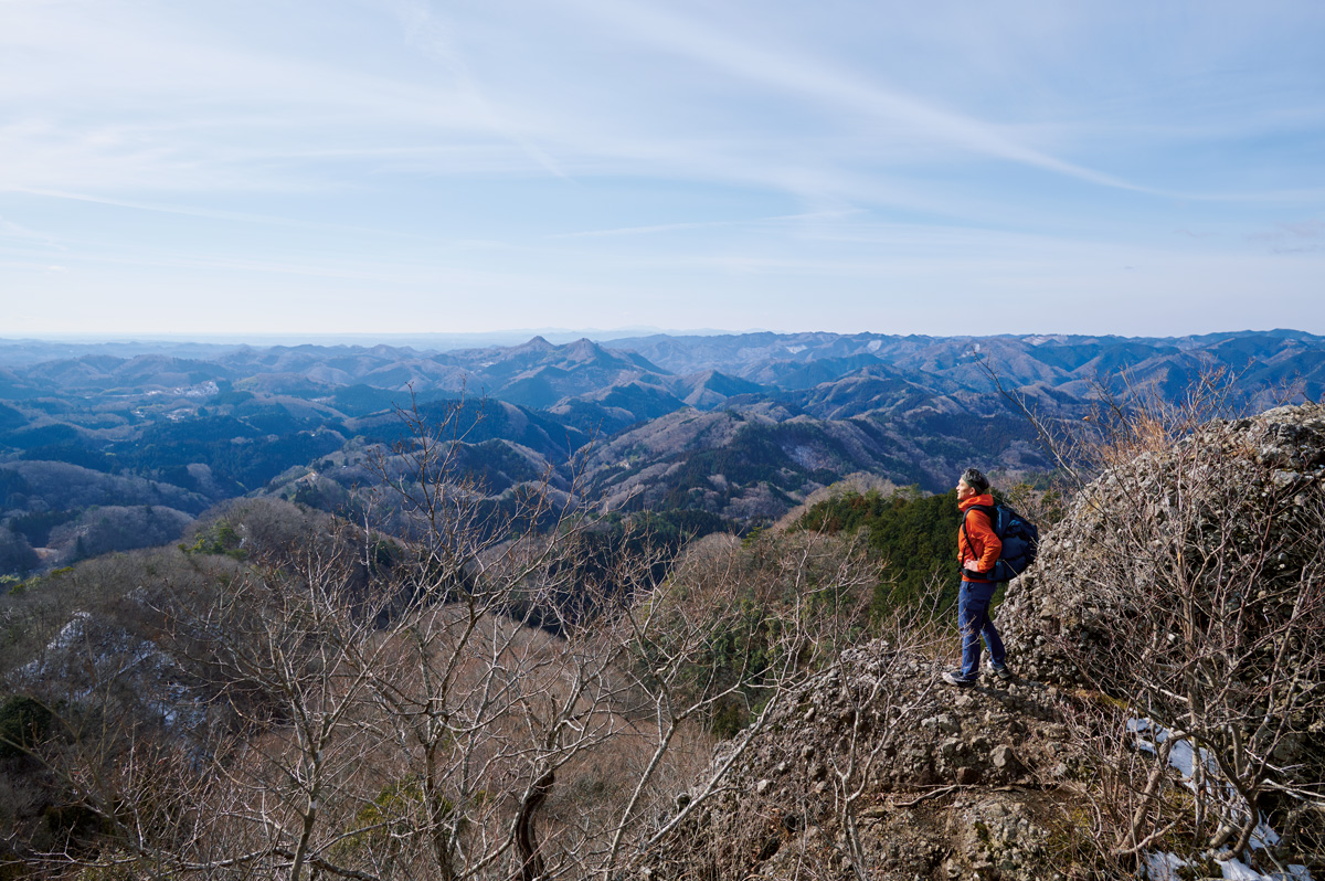 山頂の肩に立つと南へ視界が開け、太平洋、水戸市街、那須連山まで一望。足元が切れ落ちる山頂には男体神社奥社が建立されている。