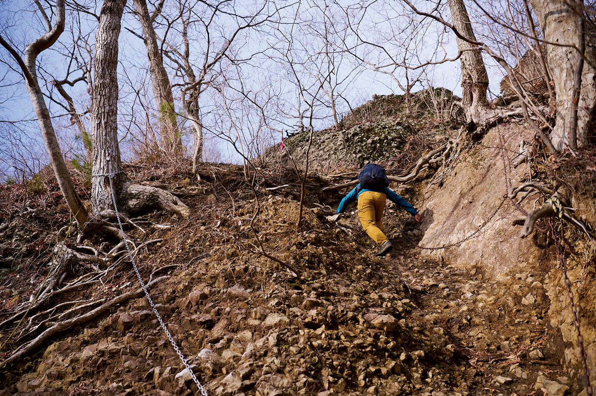 大円地から山頂までは標高差450mアップ。歩きはじめるとすぐに傾斜が強くなり鎖が連続する。太陽の位置が高くなると凍って膨張した地中の水分が溶け、あちこちで小さな落石音が!鎖に頼りすぎることなく、3点支持で落石を起こさぬよう慎重に登る。