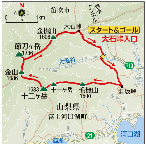 ハイライトは毛無山から十二ヶ岳まで続く岩峰上の道。ルート上には岩場、鎖場、ハシゴなどが連続し、アスレチックな登下降が楽しい。とくに十一ヶ岳と十二ヶ岳の間の鞍部に設置されている吊り橋は非常にスリリングで、度胸が試される。十二ヶ岳山頂は展望が開けており、西湖越しの富士山は迫力満点だ。